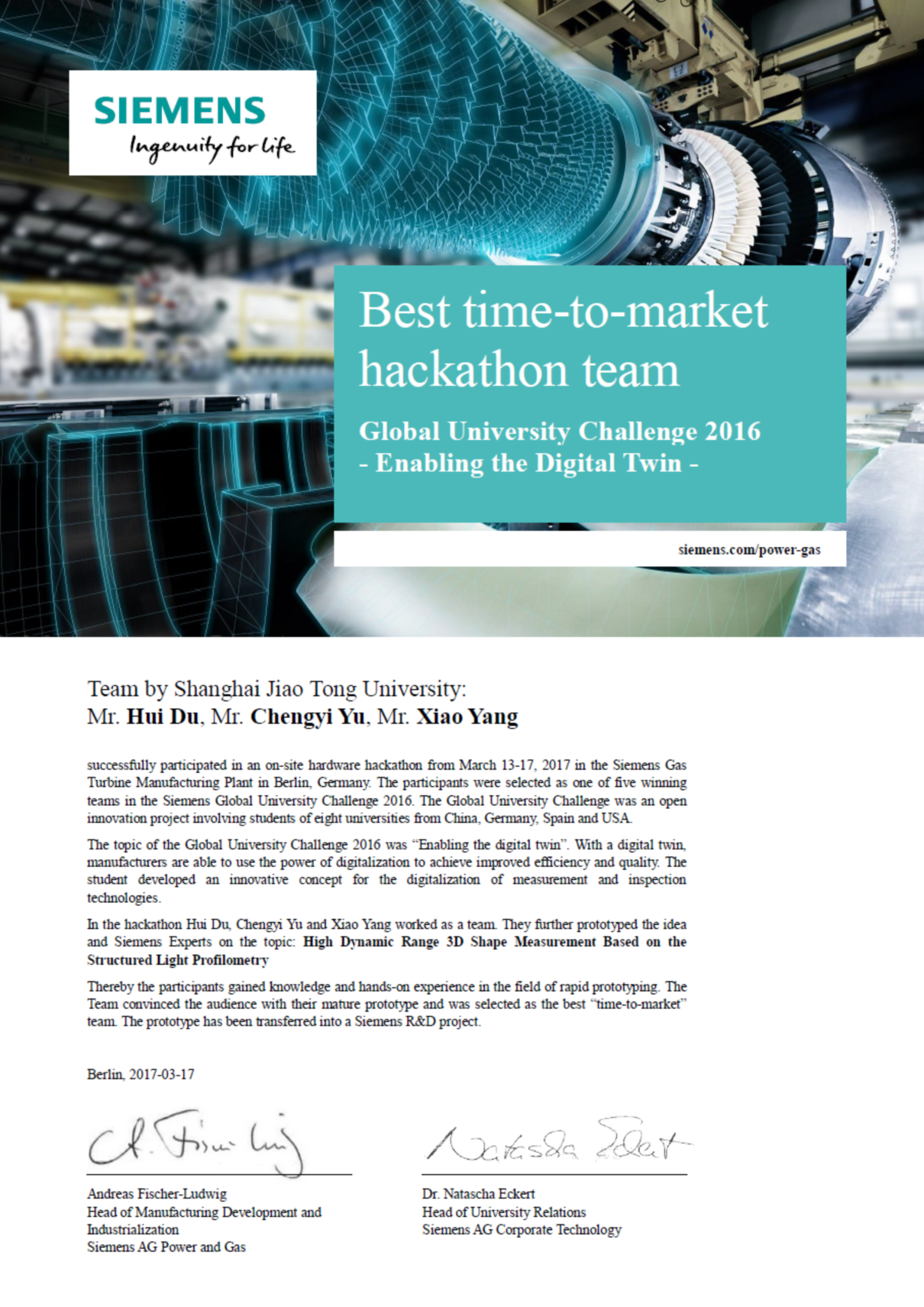 3月12日至17日,西门子全球大学挑战赛“Enabling the Digital Twin”的决赛在柏林西门子燃气轮机总部举行。由365英国官网博士生杜辉、余成义、杨肖组成的参赛队伍,在陈晓波老师的指导下,以“燃气轮机关键部件高反光金属表面三维测量技术与原型开发”的课题在全球5支决赛队伍中脱颖而出,获得了该项赛事的“最具商业价值奖”。