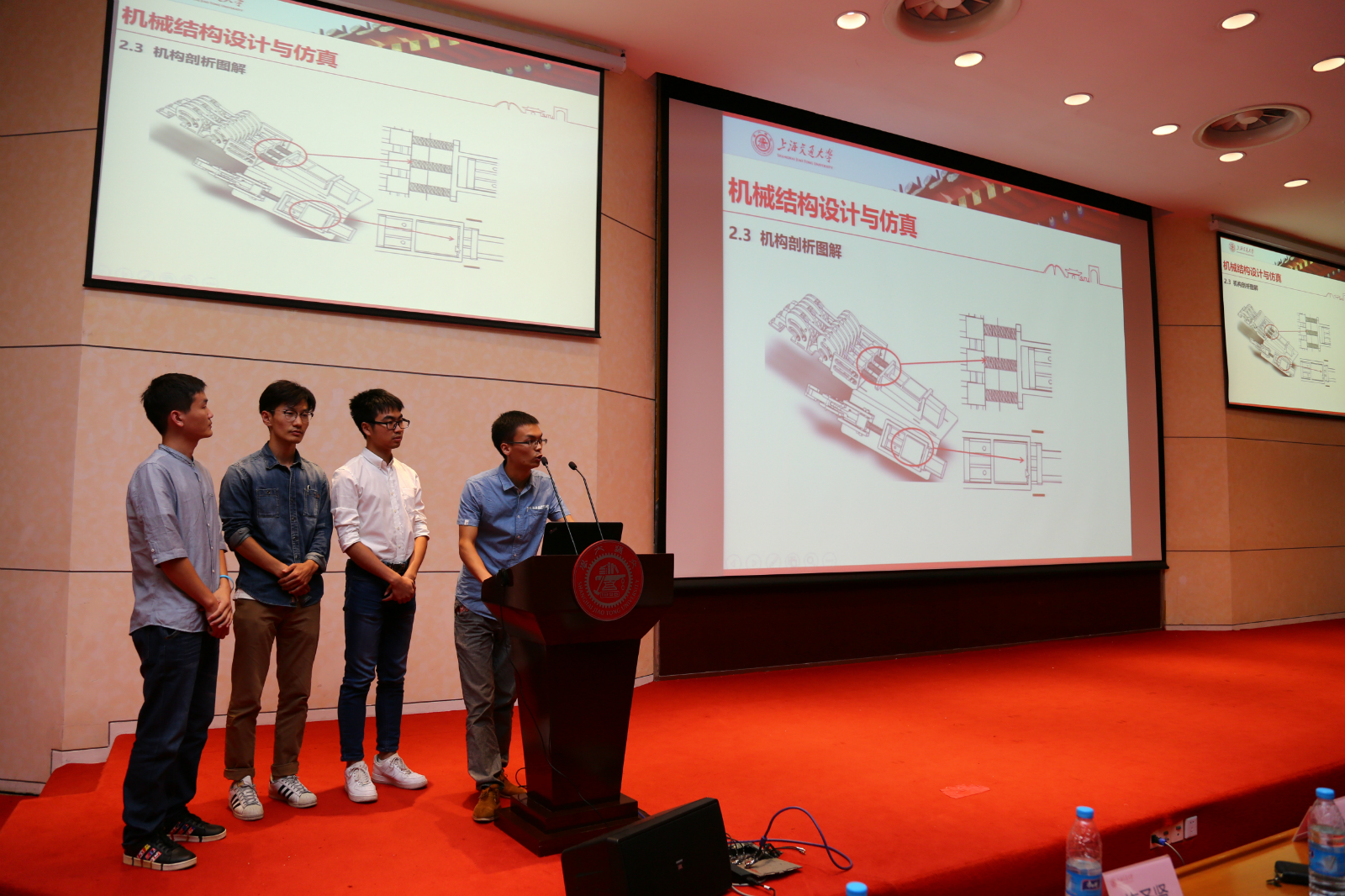 在课程项目展示环节, 7个教学班推出的34组项目团队在机械动力学院A楼广场进行项目展示。同学们通过展板和视频展示、实物演示和现场互动等环节,向评委及观众介绍了精心完成的作品,如:应用于电动汽车生产过程中动力电池总成装配环节的自动化线束插口对接设备、针对目前共享雨伞锁体结构简单回收雨伞困难而设计的基于物联网的雨伞共享平台、基于人手动作模式设计灵感的手指康复机器人、针对学校图书馆24小时还书机开发的智能图书整理小车、针对现有老人护理床功能和自动化程度缺陷问题而设计的多功能医护床、实现家居管理信息化的Insight家居智能互联系统、针对市面上导盲仪器价格昂贵而设计的智能导盲机器人等等。经过企业专家评委和校内专家评委的评选,智能图书整理小车等15组作品入围课程项目竞赛环节。