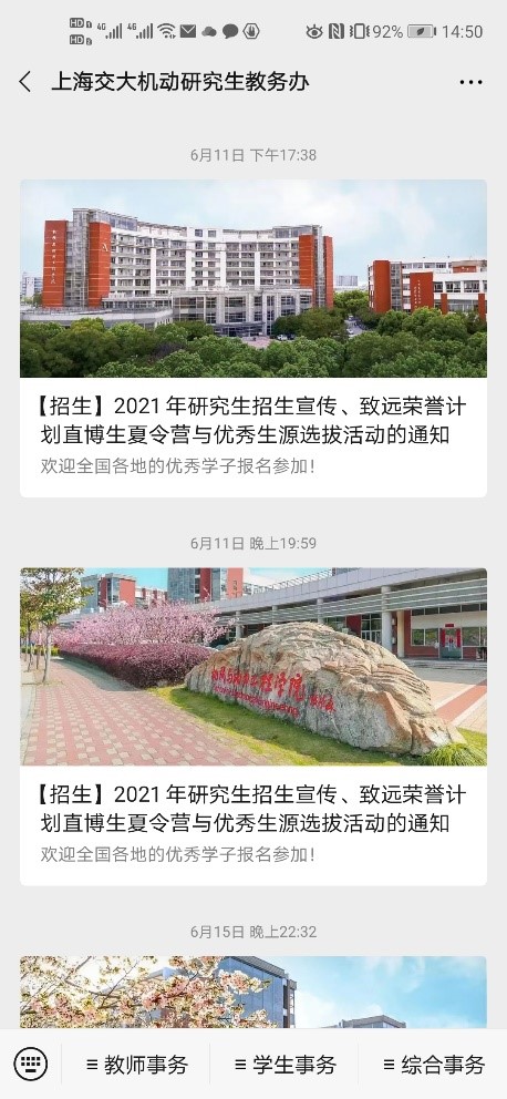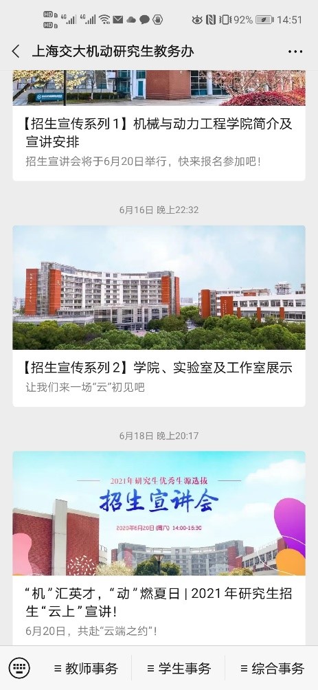 学院精心制作了招生选拔活动通知、学院简介、实验室及工作室展示、云上宣讲安排、系所介绍等一系列招生宣传推送文案,通过微信、网站、在校生等多渠道将招生信息及参与方式等推送至莘莘学子,并提前收集学生关于招生方面的问题。
