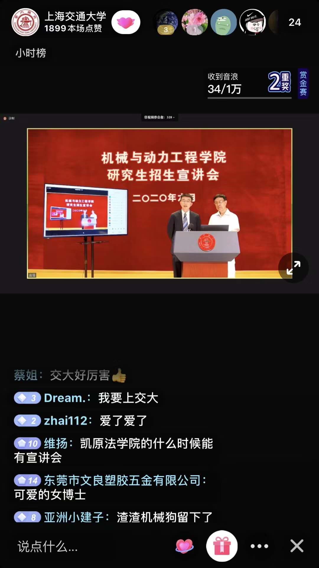 6月20日,学院党委书记杜朝辉、院长兼党委副书记彭志科、党委副书记熊振华、机械工程系主任朱利民、动力与能源工程系主任代彦军、机械学科长江学者来新民、动力学科长江学者王如竹、核科学与工程学院院长顾汉洋、工业工程与管理系主任潘尔顺、学生代表王紫璇、尹念、研究生教务办公室副主任赵晓明与全国各地优秀学子齐聚云端宣讲会,宣讲嘉宾、现场主控、导播、化妆师等工作人员多方合力、精准配合,呈现了一场饱满充实的云端招生宣讲会。