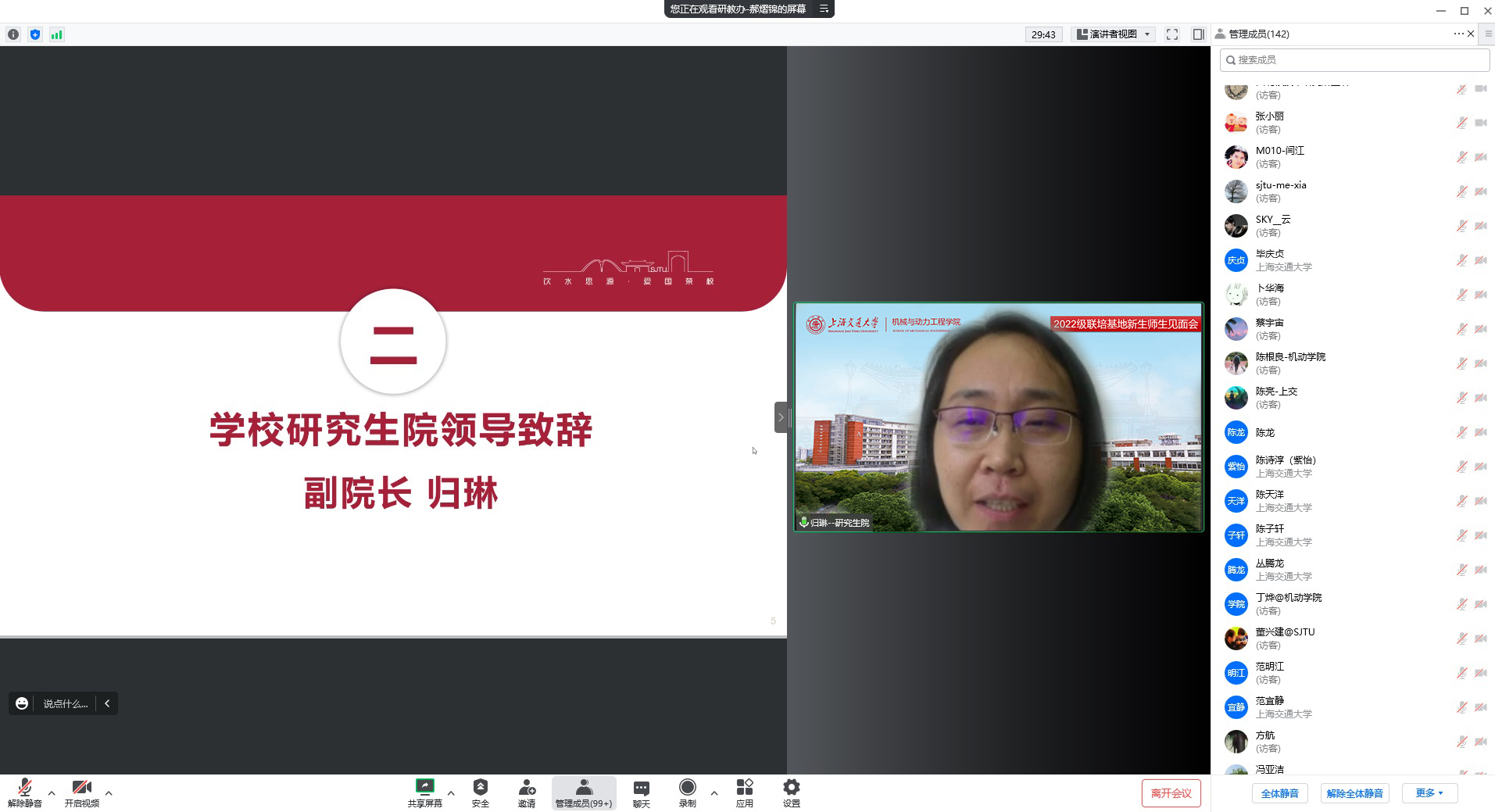 9月16日下午,365英国上市公司官网组织召开了2022级基地联培新生师生见面会,学院院长杜朝辉、学校研究生院副院长归琳、学院副院长李玉阳、研究生院专业学位办主任张小丽、西北核技术研究院院校合作科科长张科营、中国工程物理研究院高端装备与仪器工程技术研究中心副主任阳红、西北核技术研究院二所所长盛亮等8位企业导师、机电控制与物流装备研究所所长刘成良等60余名校内导师、各联培基地项目主任,以及77名2022级基地新生相聚云端。会议由中物院机械制造工艺研究所联培基地项目主任沈彬主持。