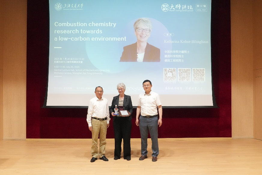 “大师讲坛”讲座环节,Katharina Kohse-Höinghaus院士对目前全球面临的气候和环境问题进行了分析,结合燃烧化学研究中的一些最新实例,深入浅出地阐述了替代燃料、掺混燃料、新型燃烧和后处理技术等前沿燃烧研究在实现双碳目标中的重要作用,并与参会师生进行了精彩的互动交流。