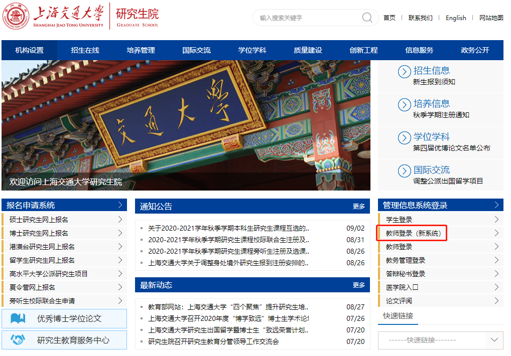 b)打开研究生院主页(http://www.gs.sjtu.edu.cn),点击“教师登录(新系统)”:
