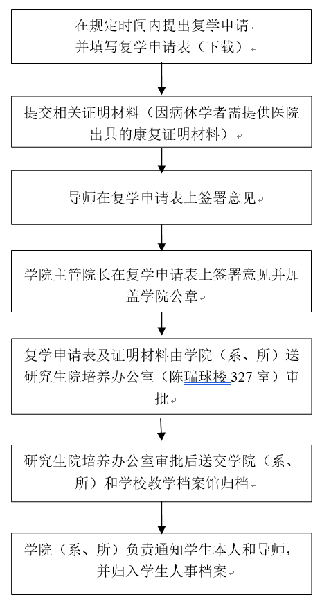 研究生休学期满要求复学者,需填写《365英国上市公司官网研究生复学审批表》,经学院(系、所)分管院长审核同意,报研究生院批准后办理复学手续。