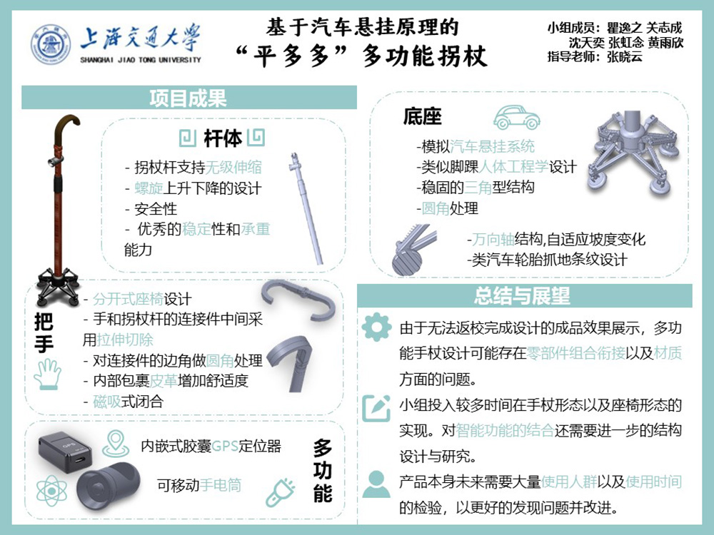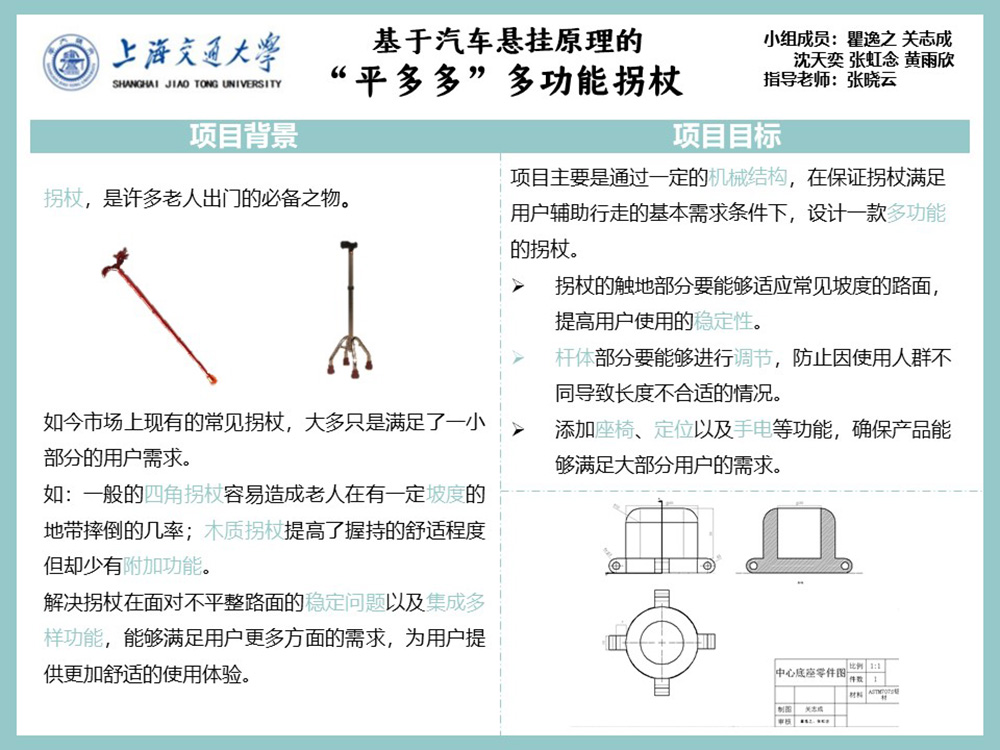 如今市场上现有的拥有较大市场的拐杖,大多在确保一方面的用户需求而又舍弃了其他方面的用户需求,如常见的四角拐杖增加了老人平地行走的稳定性却在有一定坡度的地带更加容易造成老人摔倒、木质拐杖提高了握持的舒适程度但却难以附加一些功能。本项目旨在利用基于汽车悬挂系统的原理保证拐杖能够适应多种路面,并通过特殊的结构为拐杖增加更多的诸如座椅手电等实用的功能,用一根拐杖满足用户更多方面的需求。