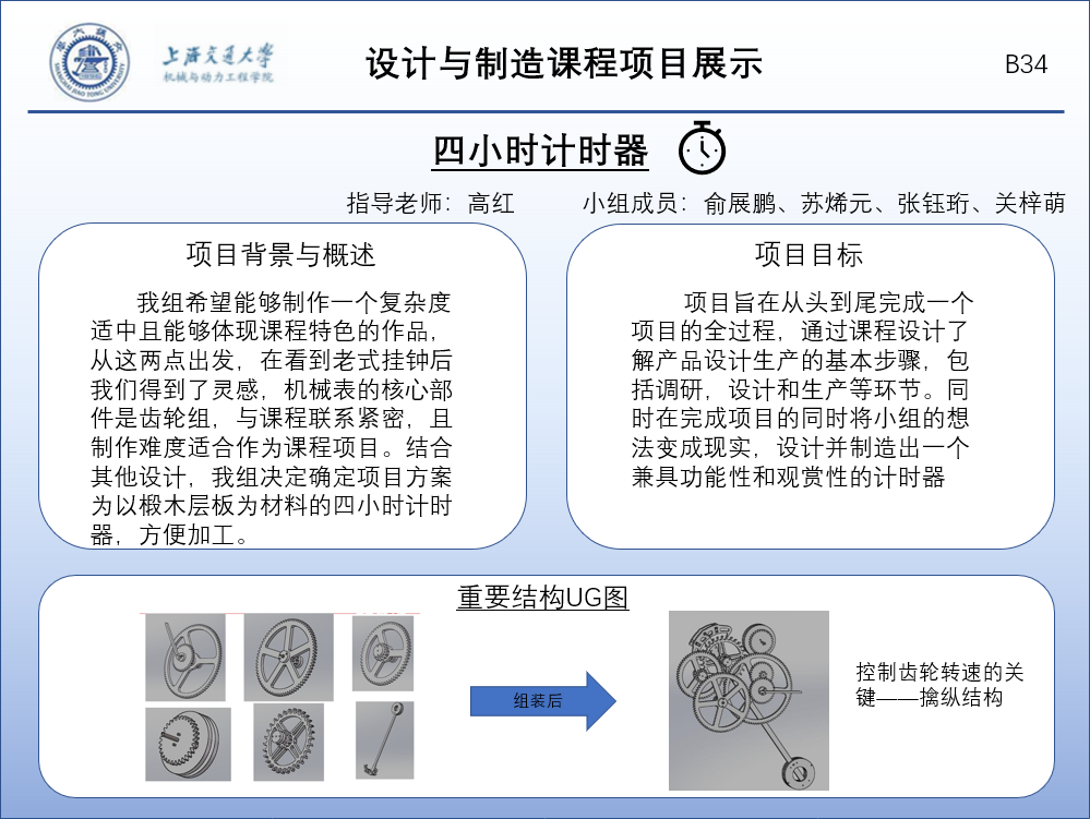 我组希望能够制作一个复杂度适中且能够体现课程特色的作品,从这两点出发,在看到老式挂钟后我们得到了灵感,机械表的传动结构由齿轮组组成,装置的动力来自发条,通过调节齿轮直径与齿数比来实现转动周期的改变,装置的外壳采用镂空式设计,从外部就可以观察到内部结构。这与课程联系紧密,且制作难度适合作为课程项目。结合其他设计,我组最终制作出了为以椴木层板为材料的四小时计时器,采用镂空齿轮设计,外观美观炫酷。