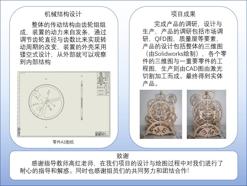 我们最终得到了符合预期的实物产品,虽然传动原理并不复杂,但在工艺上的效果还是较为突出的,项目进行中我们也完成了产品的调研,设计与生产。产品的调研包括市场调研,QFD图,质量屋等要素,产品的设计包括整体的三维图(由solid works绘制),各个零件的三维图与一重要零件的工程图,生产则由CAD图由激光切割加工而成。