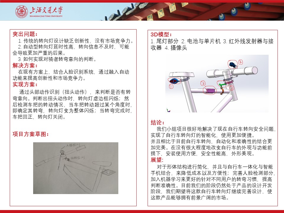 我们的项目通过摄像头,红外线感应部分来实现对于人员状态以及车把角度的获取,当人员做出扭头动作时,转向灯虚边框闪烁,提示后方车辆自己要进行转弯操作,当车把角度扭转时,转向灯整体闪烁,提供更加确切的转弯信息,车把回正,转向灯关闭,完成整个转向灯开关过程,实现了自行车转向灯的自动化控制。我们的产品操作简单,安装便捷,并且支持手机连接来提供服务,在很大程度上,为人们的自行车安全出行提供了切实的保障。