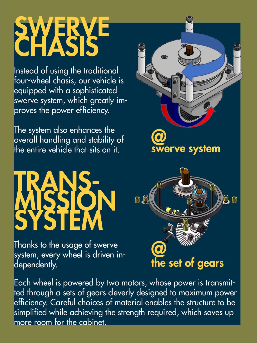 通过对35位大学生进行采访,我们了解他们对于居民区快递的需求,并再次基础上进行QFD展开,将设计目标定位在底盘结构的稳定性和行动速度及方向灵活度上。对于后两点,我们展开了多种方案设计,并最终确定了以矢量底盘为设计原型进行。区别于已有的差速控制,我们设计了速度大小和方向独立可控的矢量轮方案。在设计中,我们妥善考虑了加工要求,并制造出了模型。我们设计了部分控制程序,并配合模型进行调试,测量误差,证明该设计方案的有效性。最后提出了改进意见和后续优化方向。
