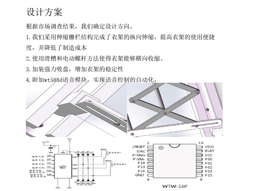 我们采用比较成熟的伸缩栅栏结构完成了衣架的纵向伸缩,大幅提高了衣架的使用便捷度,并且降低了制造成本,同时使用滑槽和电动螺杆相结合的方法成功使得衣架能够横向收缩,这高度契合我们的方便,节约空间的设计目标。另外,加装强力吸盘,增加衣架的稳定性,在电动基础上附加wt588d语音模块,以一个较为简单的设计实现语音控制的自动化,这些都使得我们的衣架设计更稳固,更便捷。通过对比市面上已有的产品,证明我们的设计具有极高的可行性,达到最初的便捷,耐久,节约空间等目标