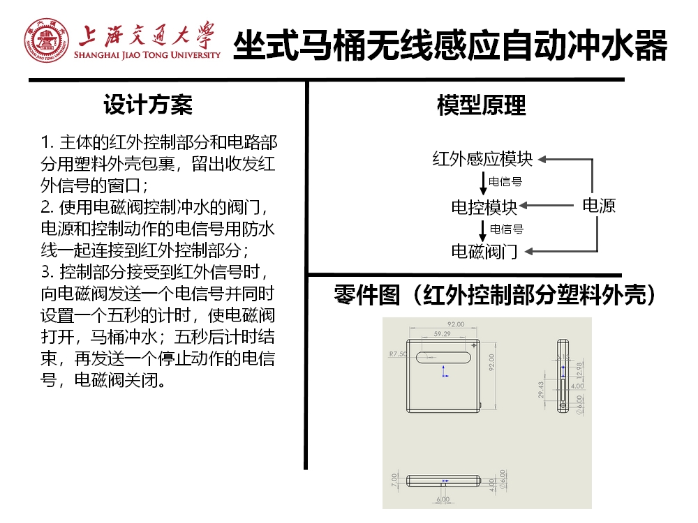 构建了项目的基础模型并给出了部分结构的零件图。主体的红外控制部分和电路部分用塑料外壳包裹,留出收发红外信号的窗口;使用电磁阀控制冲水的阀门,电源和控制动作的电信号用防水线一起连接到红外控制部分;控制部分接受到红外信号时,向电磁阀发送一个电信号并同时设置一个五秒的计时,使电磁阀打开,马桶冲水;五秒后计时结束,再发送一个停止动作的电信号,电磁阀关闭。