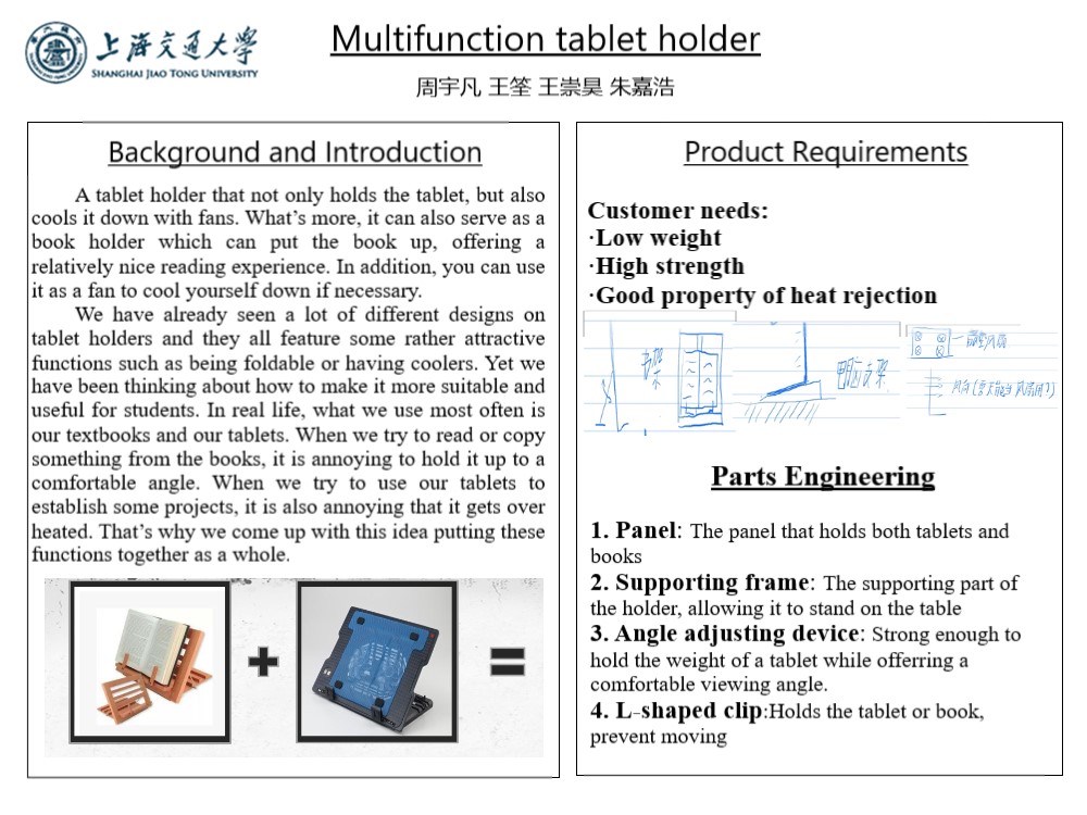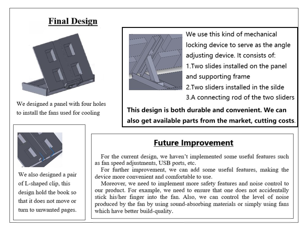 我们的项目是对传统的书托架和电脑散热架进行结合,设计制造一个更适合大学生的、用途更广的多功能电脑散热架。在项目进行初期我们小组对外进行了市场调研并在讨论后制作了关于产品的质量屋,分析出了最重要的工程需求和客户需求。项目进行中我们制定了甘特图作为时间表,设计了许多种实现方式,并最后选择了我们认为最合理的设计。最后我们将概念图制成了3D模型,方便进一步打印加工制造,受条件的影响,最后的样品暂时无法制作。