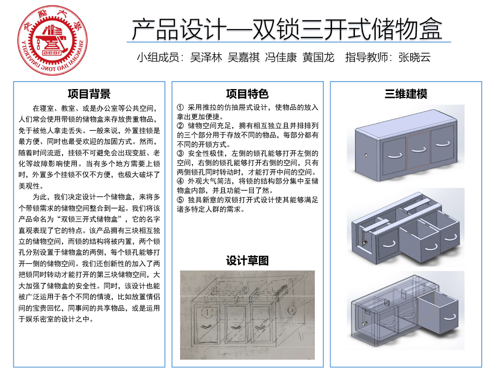 优化日常生活中使用到的带锁储物盒,丰富储物盒的功能性,扩大储物盒的适用范围,设计过程中摒弃了常见的外置挂锁,转而将锁的结构内置,同时创新地加入了两侧不同的锁同时转动才能打开的部分,不仅大大加强了安放在寝室、教室等公共空间的储物盒的安全性,也满足了部分特定人群的需要。