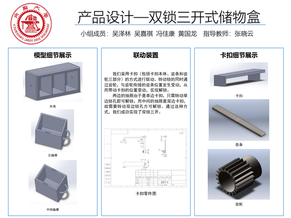 我们设计的产品是“双锁三开式储物盒”,它的名字直观表现了它的特点。该产品拥有三块相互独立的储物空间,而锁的结构将被内置,两个锁孔分别设置于储物盒的两侧,每个锁孔能够打开一侧的储物空间。我们还创新性的加入了两把锁同时转动才能打开的第三块储物空间,大大加强了储物盒的安全性。同时,该设计也能被广泛运用于各个不同的情境,比如放置情侣间的宝贵回忆,同事间的共享物品,或是运用于娱乐密室的设计之中。