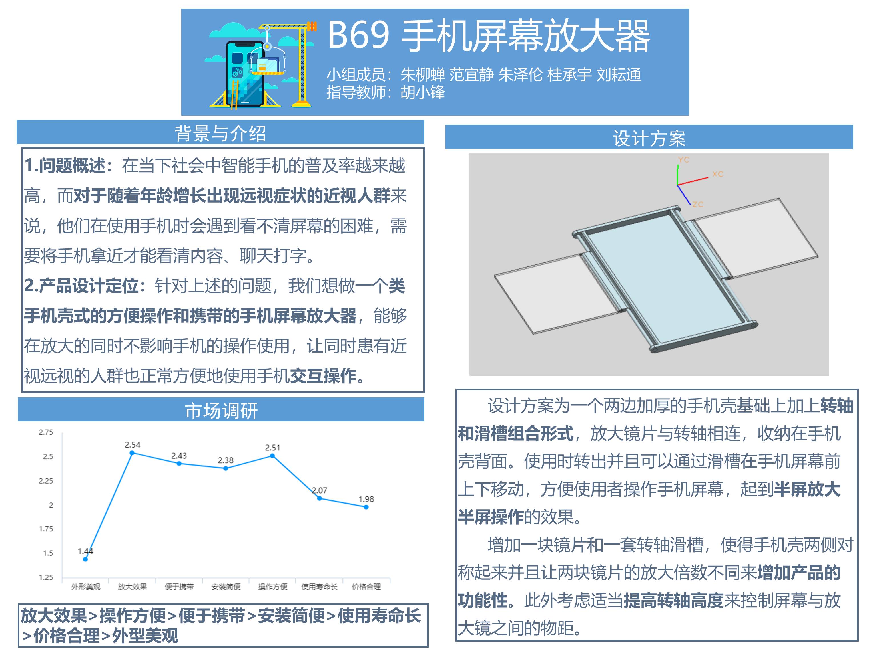 成功设计了一款自带放大镜的手机壳,基本满足提出的设计要求,多次对旋转滑动机械结构进行优化,在不需要使用的时候可以将凸透镜折叠,使得装置结构小巧紧凑。