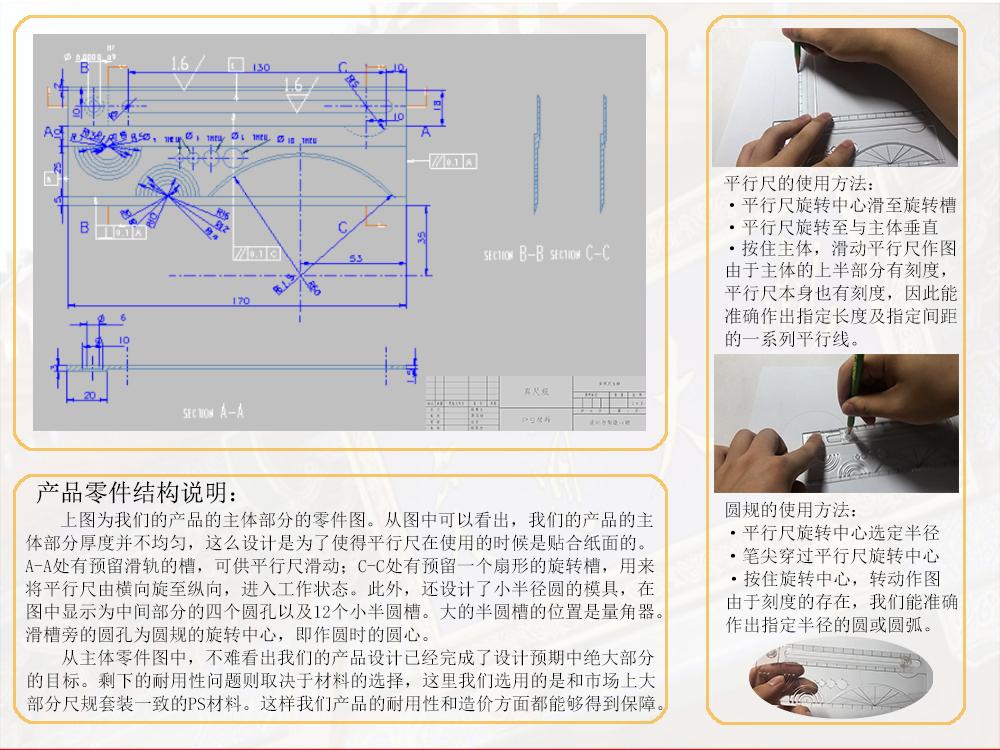 各种各样的绘图工具太多是否使你眼花缭乱?两尺共用绘制平行线是否使你左支右绌?难以固定圆心的圆规是否使你心烦意乱?为了解放千千万万绘图者的双手,真尺规项目应运而生。真尺规将常见绘图工具融为一体,麻雀虽小但五脏俱全。利用特殊设计的旋转中心与平行尺,帮您轻松完成绘制平行线、任意半径绘圆、增大直尺量程等复杂操作。真尺规采用了特殊设计的拱形量角器,既能完美测量角度,又提升了美观程度。不仅如此,真尺规与普通尺规相比,不需采用任何特殊材料,是性价比的杀手。