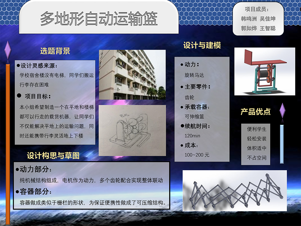 在生活中,我们经常能够看到许多疲惫不堪的身影,或是拖着巨大的行李箱在寝室楼前望而却步的女同学,或是买菜回家拖着极重的手拉车步履蹒跚的老太太,由此可见,搬运重物成为了从年轻到年迈所有年龄段普遍存在的问题。因此,作为高校工科类学生,我们打算制作一个能够适用于不同场合、不同人群、不同环境的代搬运工具,即多地形自动运输篮。