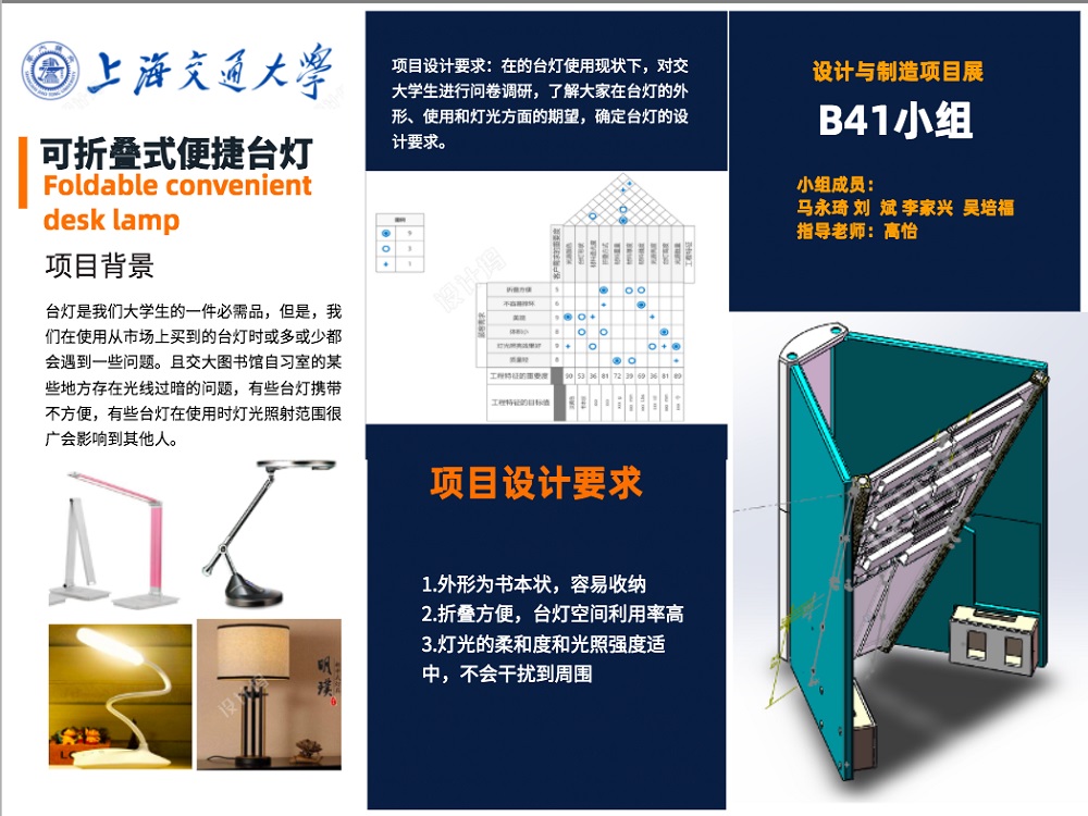 调研学生对可折叠台灯的需求,根据调研结果合理设计台灯折叠前形状,便于在书包中收纳携带也要保证美观性;通过嫁接折纸工程的应用成果,优化改造台灯折叠结构,提高美观性和空间利用率;对灯光照射效果评估,通过市场调研和内测设计合理的灯光照射角度、范围,在保证照明效果的同时减少对周围同学的影响;规划产品加工方案,包括材料、加工工艺等方面,对加工难点进行预测并提出应对方案;估算产品的模型成本价格与成品价格,为台灯能够批量生产做好方案预算。