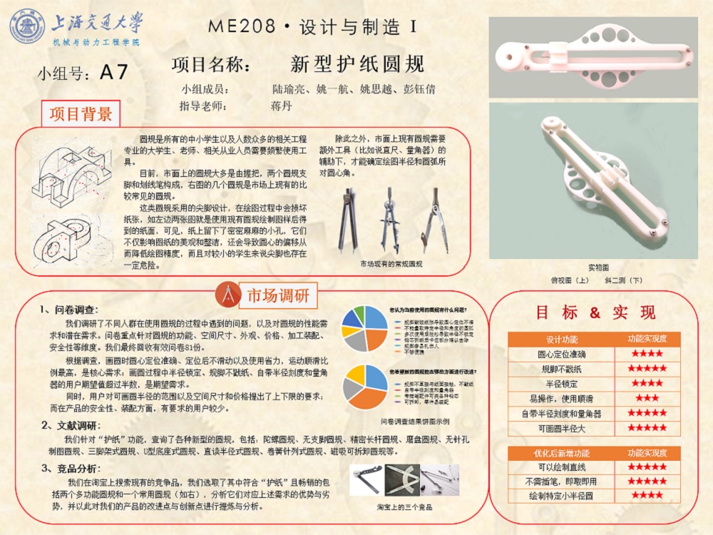 圆规是所有的中小学生以及人数众多的相关工程专业大学生、老师、相关从业人员需要频繁使用工具。但是目前,市面上的圆规大多采用尖脚设计,在绘图过程中会损坏纸张,不仅影响图纸的美观和整洁,还会导致圆心的偏移从而降低绘图精度,而且对较小的学生造成潜在危险。除此之外,市面上现有圆规需要额外工具的辅助下,才能确定绘图半径和圆弧所对圆心角。所以, 本项目旨在设计一种新型圆规,主要针对圆规画圆半径角度直读和防止圆规对纸张的损害两个问题进行探索。