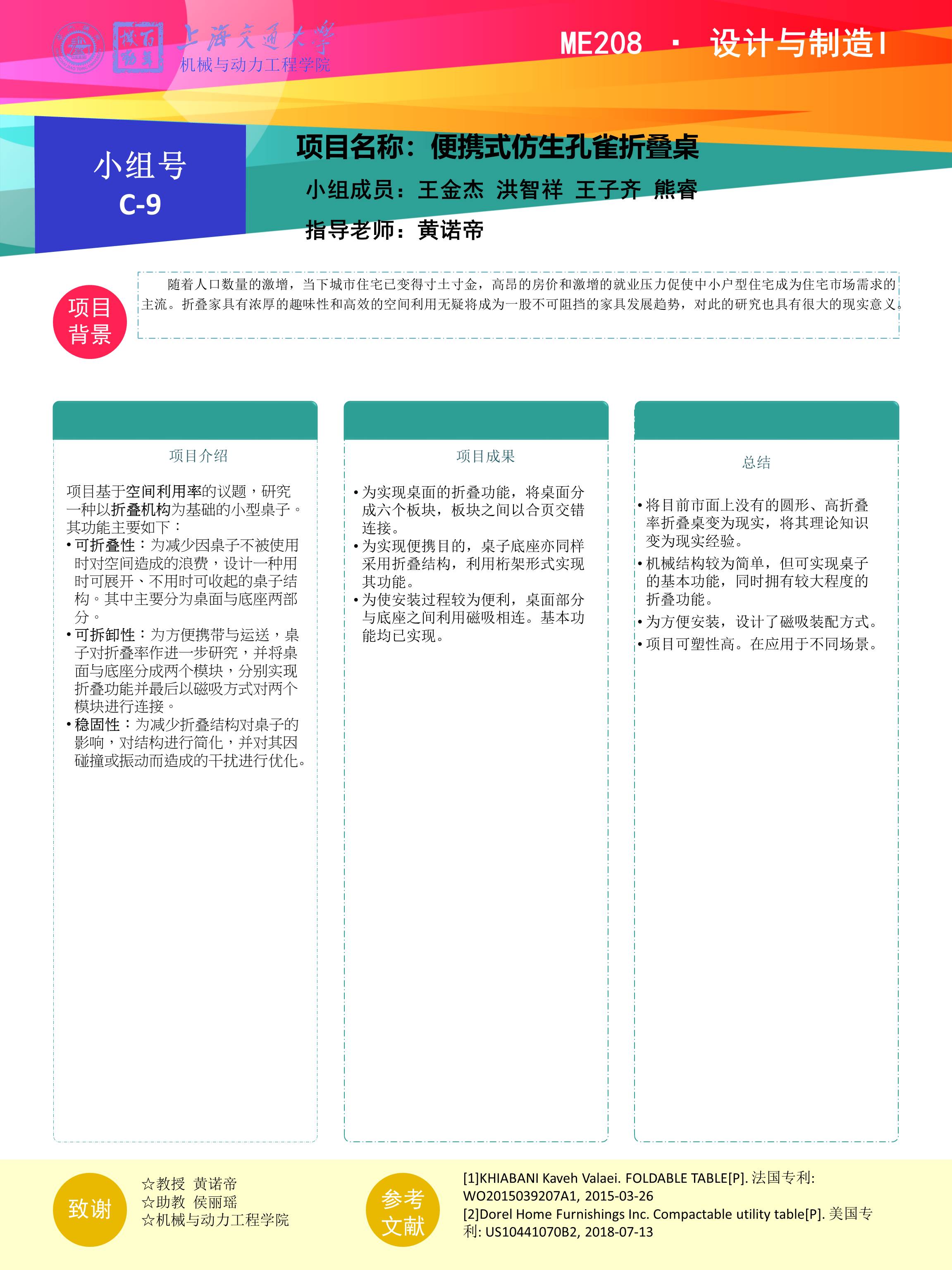 项目基于空间利用率的议题,研究一种以折叠机构为基础的小型桌子。其功能主要如下,可折叠性:为减少因桌子不被使用时对空间造成的浪费,设计一种用时可展开、不用时可收起的桌子结构。其中主要分为桌面与底座两部分。可拆卸性:为方便携带与运送,桌子对折叠率作进一步研究,并将桌面与底座分成两个模块,分别实现折叠功能并最后以磁吸方式对两个模块进行连接。稳固性:为减少折叠结构对桌子的影响,对结构进行简化,并对其因碰撞或振动而造成的干扰进行优化。