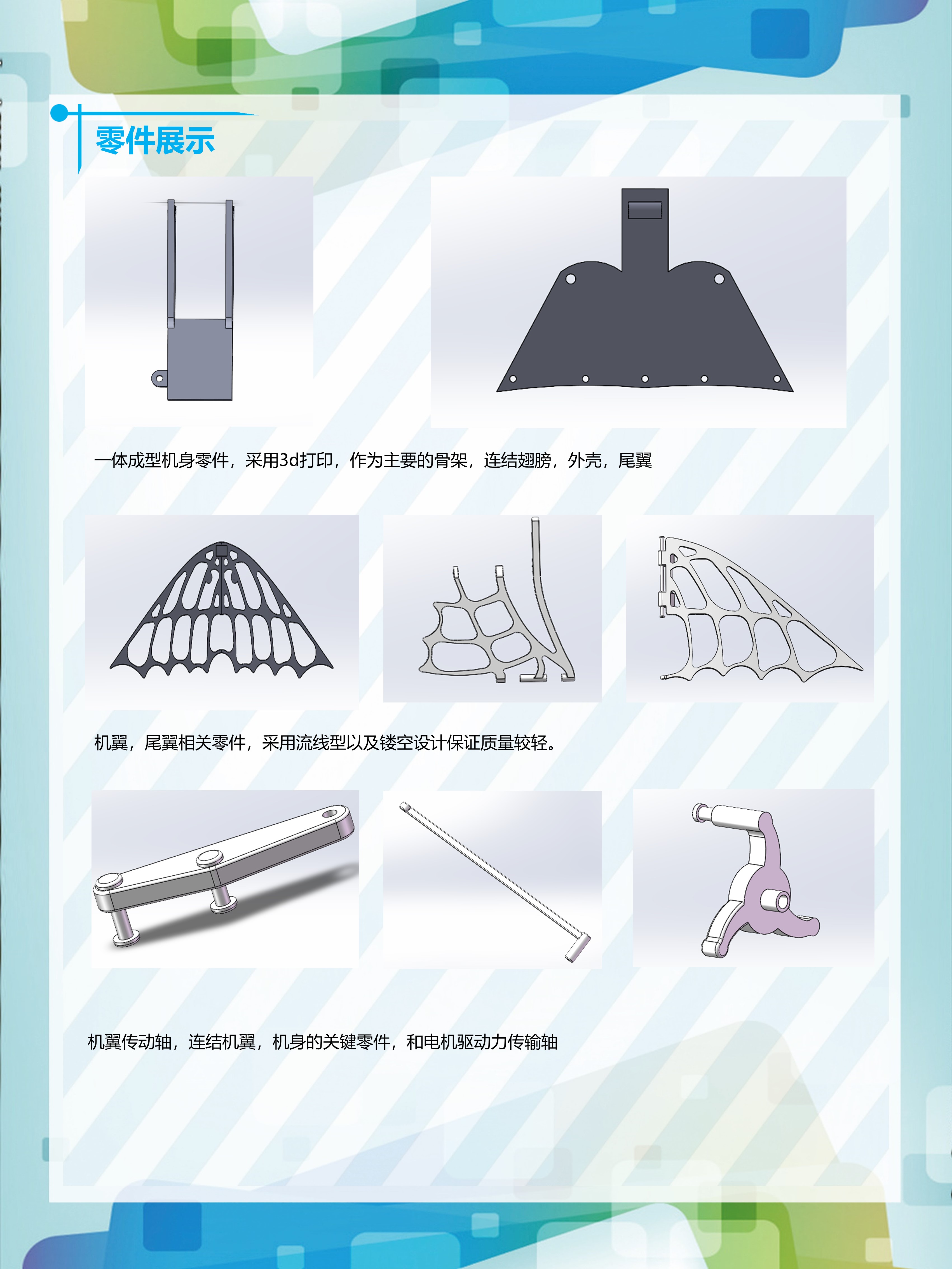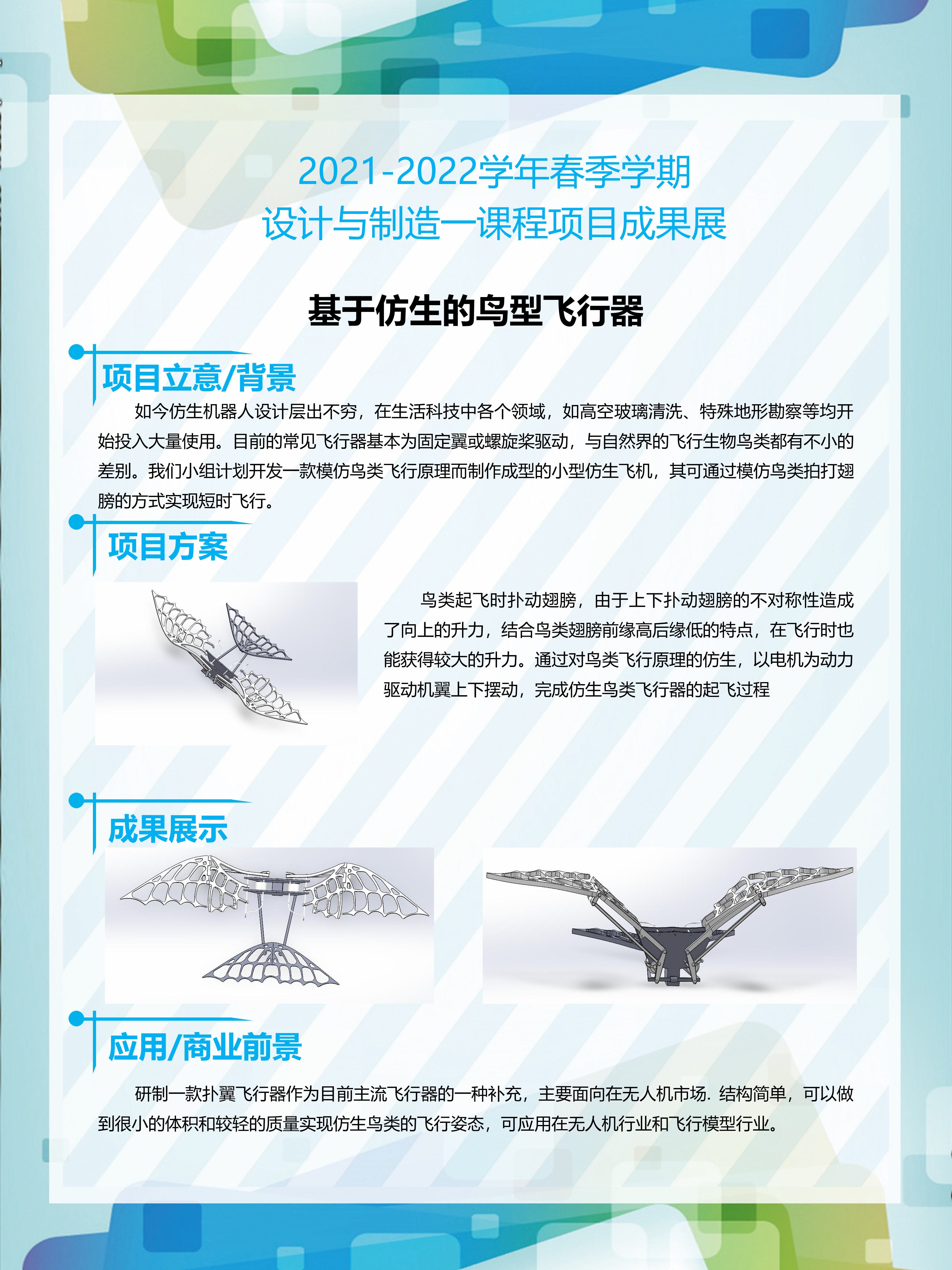 本项目研究鸟类飞行扑翼的姿态、学习鸟类飞行的知识,旨在设计一款仿生鸟类的飞行器,希望通过仿生的机械结构模拟鸟类飞行的姿态,对未来人类的飞行器进行展望。
