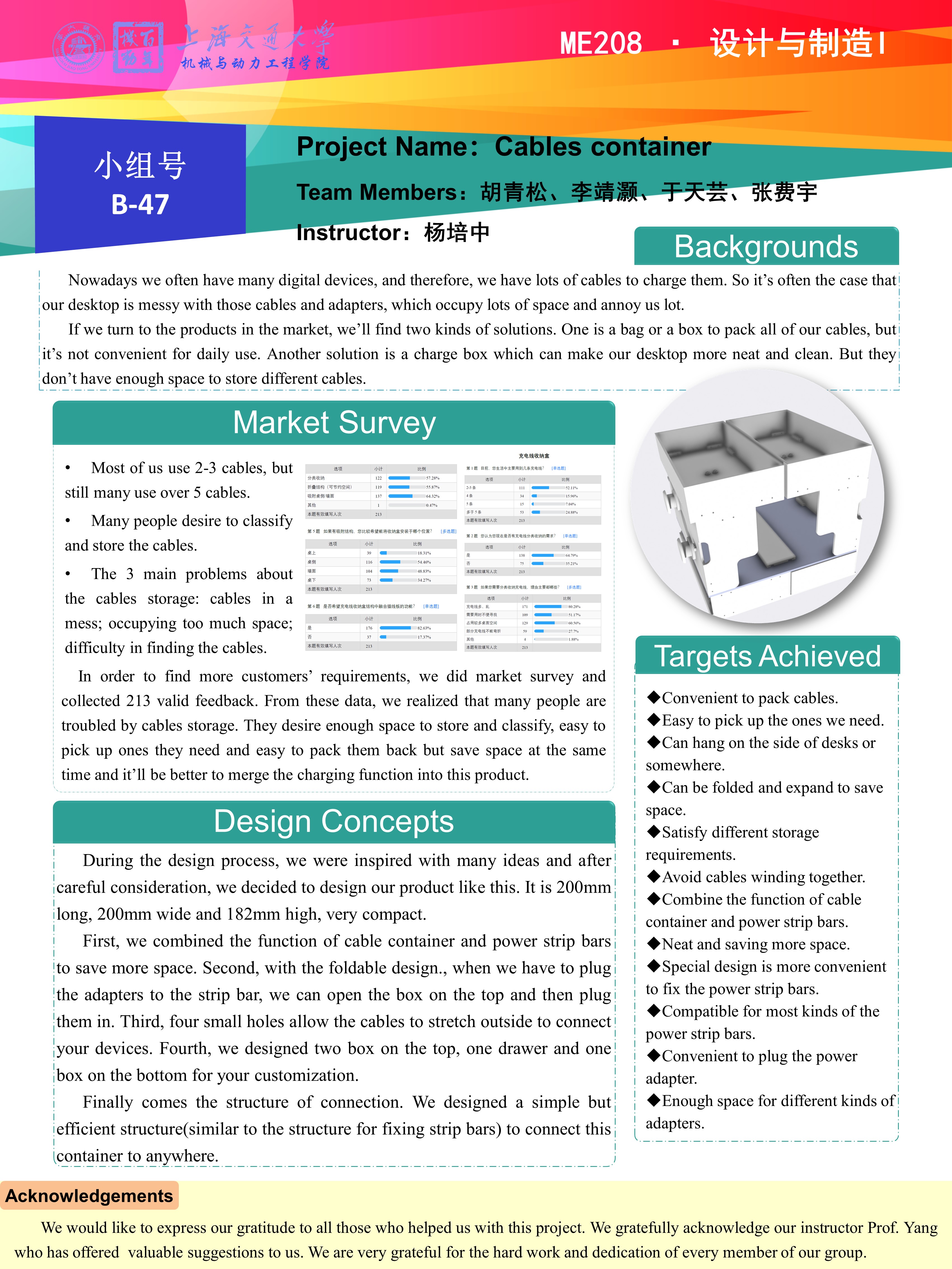 Nowadays we often have many digital devices, and therefore, we have lots of cables to charge them. So it’s often the case that our desktop is messy with those cables and adapters, which occupy lots of space and annoy us lot. Our project is to design an improved type of cables container. According to our market survey, we have found that the current bag or a box designed to pack all of our cables is not convenient. Another kind of product is a charge box which can make our desktop more neat and clean but they don’t have enough space to store different cables. So we hope to design a cables container that is both convenient to pack cables and easy to store different kinds of cables.