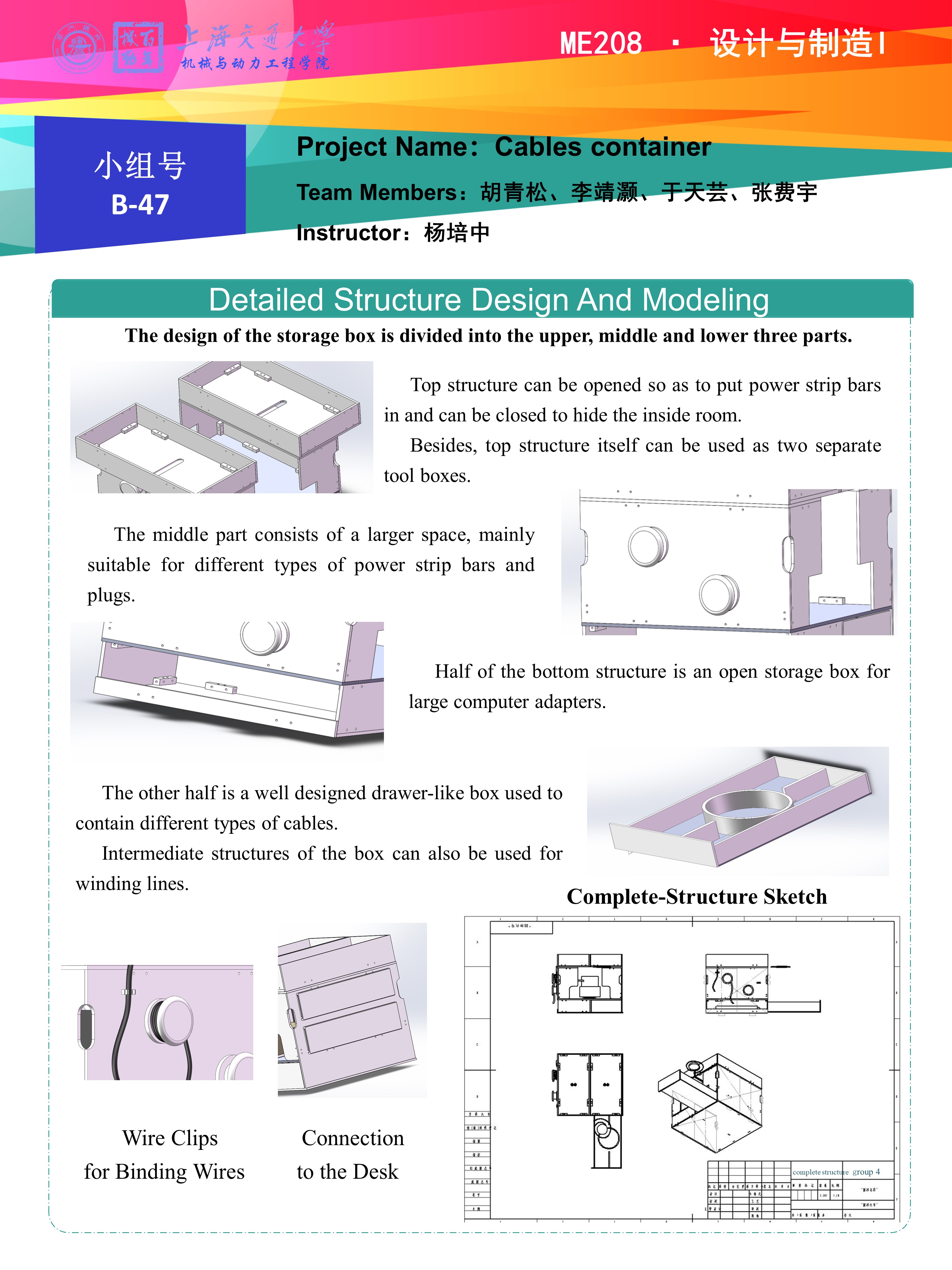 The cables container designed is about 200mm×200mm×182mm in size. It can be divided into 5 parts: the main part, the foldable design, more detailed design, customization design and the connection part. For the main part, we combine the function of the cables container and the power strip bars to save more space. For the detailed design, we use four small holes to allow the cables to stretch outside to connect your devices. And after finishing charging, if you are not willing to pack the cables, you can just wind them on this coil and fix it on the this little structure. For the foldable design, we can open the box on the top and then plug the adapters into the strip bars. This design saves more space and we prepared enough space for different adapters. So when we are charging our devices, we can only see several cables stretching out of the box and our desktop becomes more neat. For customization design, we designed two boxes on the top, one drawer and one box on the bottom. The space inside the drawer is split into 5 parts to meet different store requirements or to just classify the cables. For the connection part, we designed a simple but efficient structure(similar to the structure for fixing strip bars) to connect this container to anywhere. And it’s easy to unfix and connect.