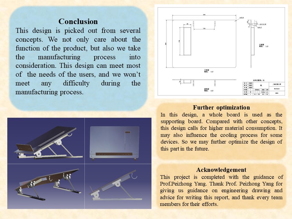 We hope to develop a multi-functional support that can simultaneously have the functions of reading book support, laptop support, earphone storage, stationery storage and other functions. It adopts the portable design to realize the high integration of various functions at the same time and takes the mechanical structure as the main innovation point. Make the final product guarantee the functionality of both firmness, beauty and relatively high cost performance, in order to occupy a certain market share.
