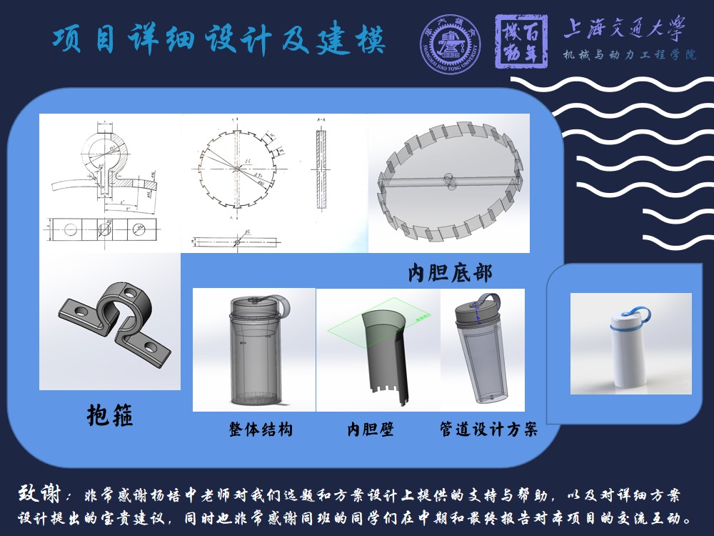 我们小组根据市场调查结果以及设计制造中可能会出现的问题进行项目开展。我们设计出了外杯与内胆结合的形式,内胆主要实现毕达哥拉斯杯的主要功能,而外杯主要作为盛放漏出液体的容器,从而使产品兼具创意趣味性和实用性。同时,我们将虹吸管设计在内胆壁上,使得产品外观简洁且结构巧妙。本产品计划采用ABS塑料和304不锈钢作为主要材料,成本较为低廉,最终价格大致控制在50元左右。综上,本项目最终项目成果满足项目设计主要目标。