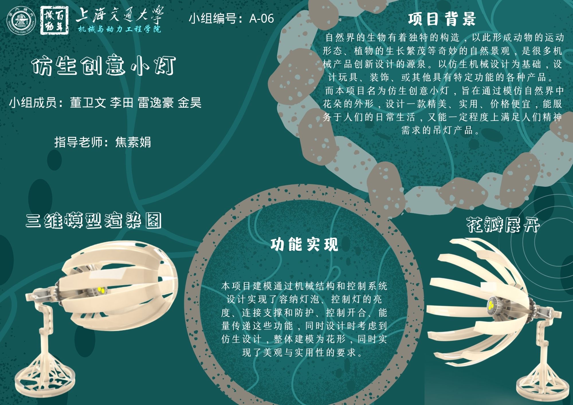 自然界的生物有着独特的构造,以此形成动物的运动形态、植物的生长繁茂等奇妙的自然景观,是很多机械产品创新设计的源泉。以仿生机械设计为基础,设计玩具、装饰、或其他具有特定功能的各种产品。
