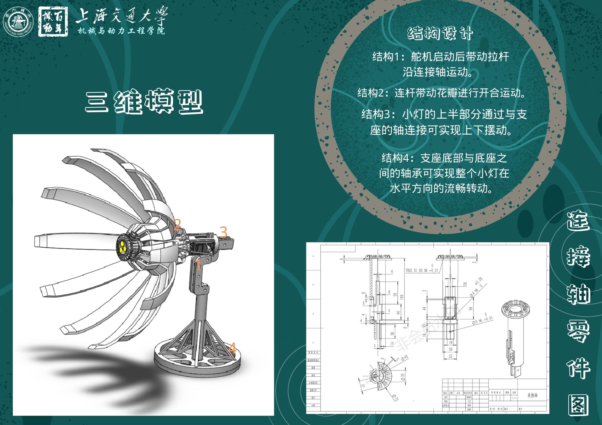 产品包含多个零件,能完成控制结构开合和灯的亮度的功能,动力来源体现低碳环保,运用仿生结构。