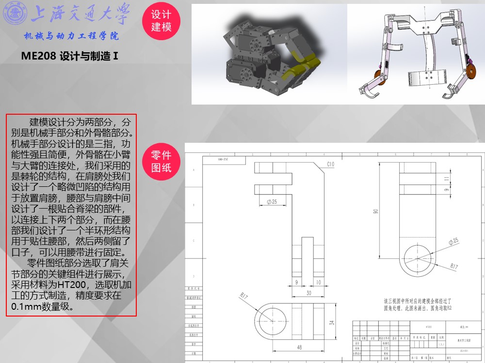 本小组设计项目是无源上肢外骨骼及其外延的机械手。无源上肢外骨骼通过对上肢肌肉与骨骼的仿生,实现在搬运重物时将肘关节处所需提供给小臂的力矩转移至背部:主要采用刚性杆的强度结构传递载荷,肩带,腰带与支撑结构将载荷合理分布于背;外延部分的机械手通过对手指肌肉与骨骼的仿生,实现相对复杂的抓握功能:通过舵机控制与机械结构自身的几何约束,机械手的三根手指各有一个自由度,预留了腕关节处的连接孔位,用以连接无源上肢外骨骼。