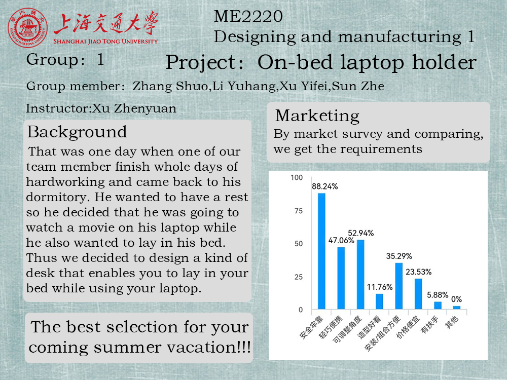 该产品的主要目标群体为有需求在床上使用电脑的人,使颈部受到合理的保护。根据不同需求,使用范围也可以扩展到放在桌上或腿上等情景当作电脑支撑架。目前已经实现在床上放置的功能,并且能够自由调整高度和角度,收纳方便。未来希望能对结构进行优化,比如使高度调节选择性更大。也可以配备一些如水杯架、散热器之类的组件,还希望能通过对支撑架进行改造以适应多样化情景下的需求。