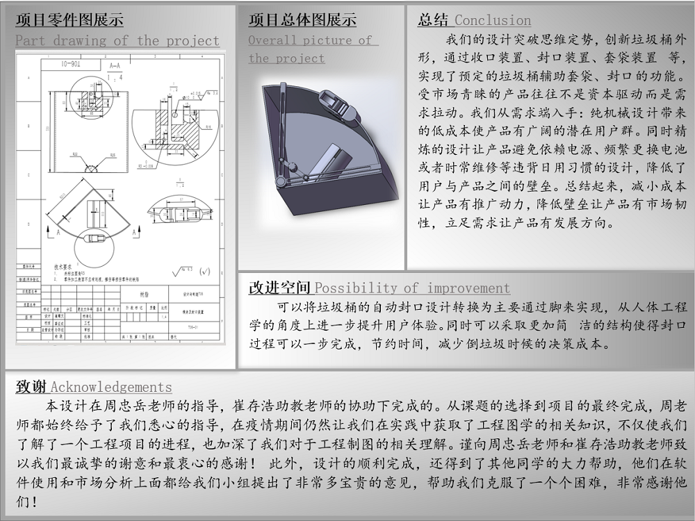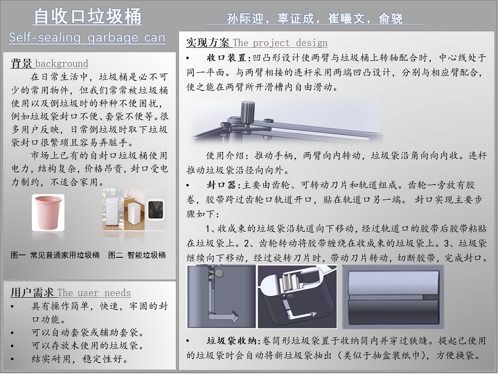 本小组成功设计了可实现垃圾袋方便卫生封口和套袋功能的纯机械垃圾桶。该垃圾桶结构清晰,只需要直线推动手柄即可完成垃圾袋的收口,再下拉实现封口,全程只需要一只手操作。底部还带有垃圾袋存放装置,既方便存放也辅助套袋。同时垃圾桶截面呈扇形,可以倚靠墙角,使垃圾桶不易翻倒并充分利用空间。垃圾桶功能全部由机械完成,成本低,稳定性高,不受插口限制,适合家用并易于推广。