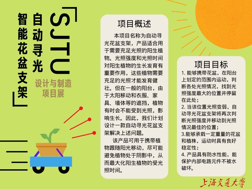 本项目名称为自动寻光花盆支架,产品适合用于需要充足光照的阳生植物。光照强度和光照时间对阳生植物的生长发育有重要作用,这些植物需要充足的光照才能发育健壮。但在一般的阳台,由于太阳移动和衣服、家具、墙体等的遮挡,植物有时会不能受到光照,影响生长。因此,我们计划设计一款自动寻光花盆支架解决上述问题。该产品可用于携带植物跟随阳光移动,尽可能避免植物处于阴影中,从而最大化阳生植物的受光照时间。