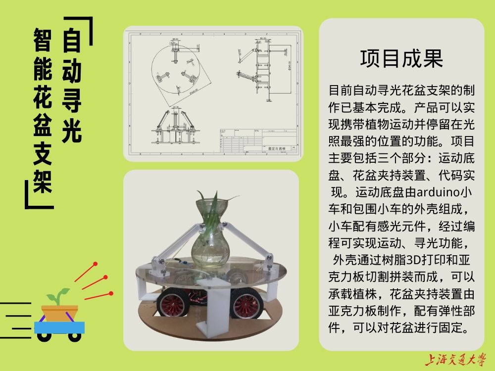 目前自动寻光花盆支架的制作已基本完成。产品可以实现携带植物运动并停留在光照最强的位置的功能。项目主要包括三个部分:运动底盘、花盆夹持装置、代码实现。运动底盘由arduino小车和包围小车的外壳组成,小车配有感光元件,经过编程可实现运动、寻光功能,外壳通过树脂3D打印和亚克力板切割拼装而成,可以承载植株,花盆夹持装置由亚克力板制作,配有弹性部件,可以对花盆进行固定。