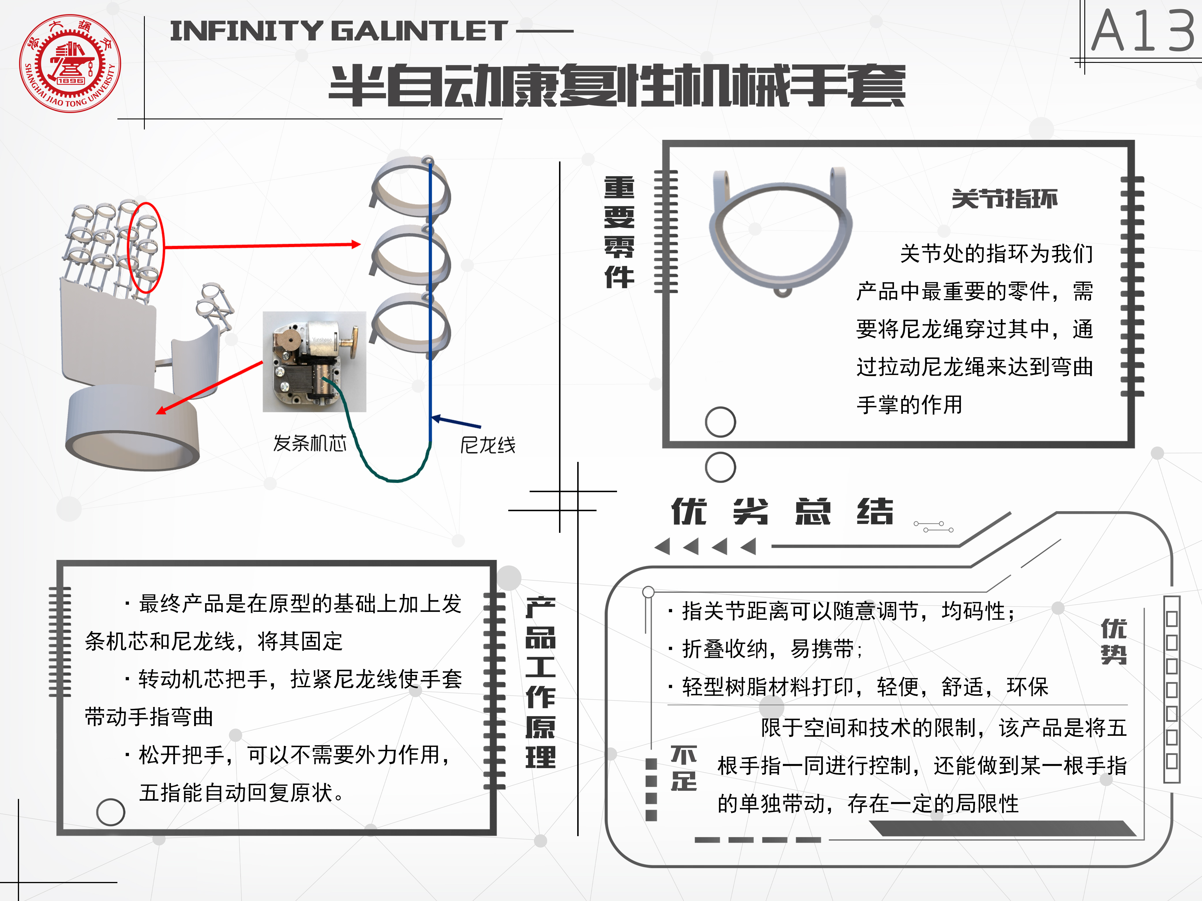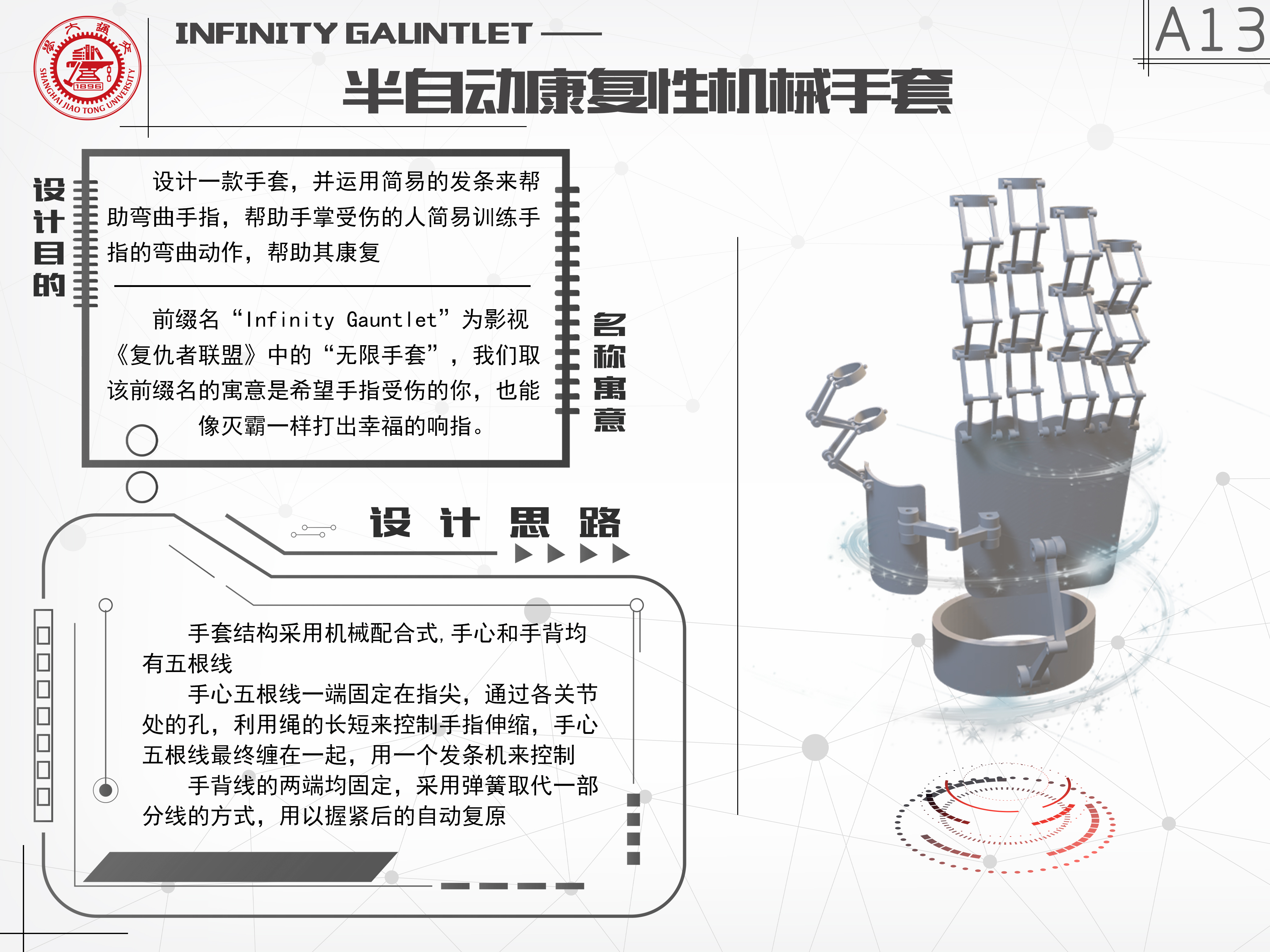 在生活中经常会有手指受伤事件的发生,如何进行简便且有效的手指康复成为一大难点,因此开发一款简便廉价的辅助性机械手套来帮助受伤手指进行康复存在一定的合理性以及必要性。本小组预计设计一款帮助手指受伤者进行手指康复的手套,通过进行简易的拉伸动作以及模拟手指的弯曲从而促进手指受伤者康复。在经过小组讨论分析以及改进优化后,最终决定通过利用弹性拉伸以及八音盒自动回转的原理来实现手套的工程设计需求。