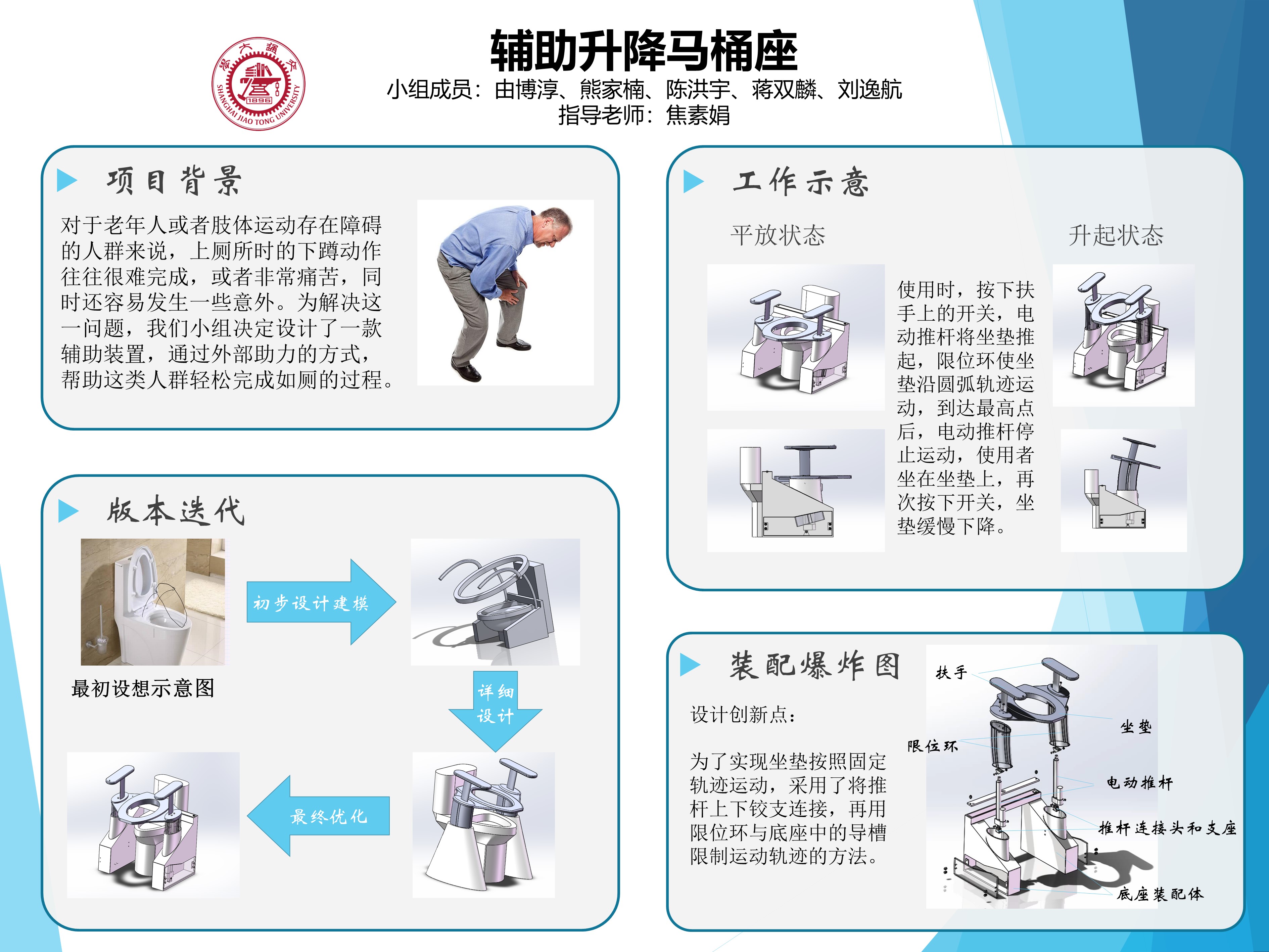 小组针对腿脚不便的老年人或残疾人设计了辅助升降马桶座,完成了社会调研、QFD分析、详细设计等步骤。QFD分析确定了产品重要特征和参数;详细设计环节中,机械部分用solidworks软件完成了底座、动力装置、支撑限位结构、坐垫、扶手、紧固件等主要结构的建模和装配,绘制零件图和工程图,并进行合理的有限元分析和材料选择,完成了数字样机的初步建立。电路部分完成了单片机、负反馈装置、电源、开关等元件的结构分析和方块图绘制。虽为制造实体样机,但前期设计基本符合要求,完成度良好。