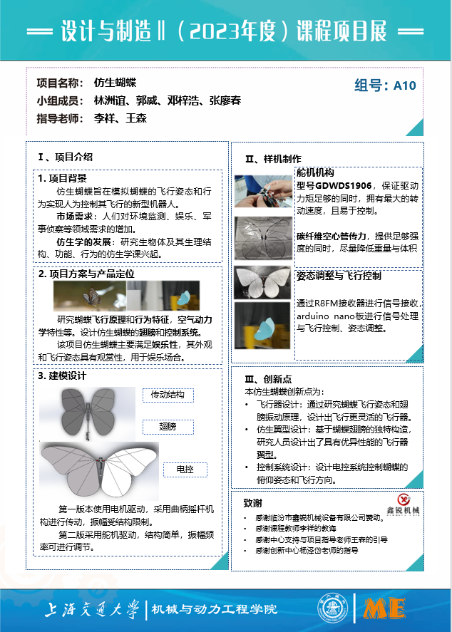 本项目最主要目标是以蝴蝶的飞行方式实现可控飞行。具体包括翼片设计、驱动结构设计、控制模块设计等三大方面。要求飞行的距离越长越好、可控性越高越好。