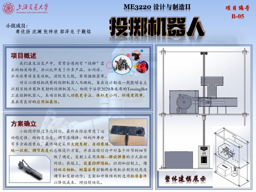 项目依托挑战赛,旨在设计一个能够自动识别目标圆、自动调整并将网球准确投入目标圆、且能够自动装填的投掷机器人。该机器人能够同时观察并识别多个目标圈,随后自动控制相关电机完成射程调节、网球发射和再装填等操作。通过标准化、模块化设计,产品能够实现零件快速更换和系统改装,具有较好的拓展性。