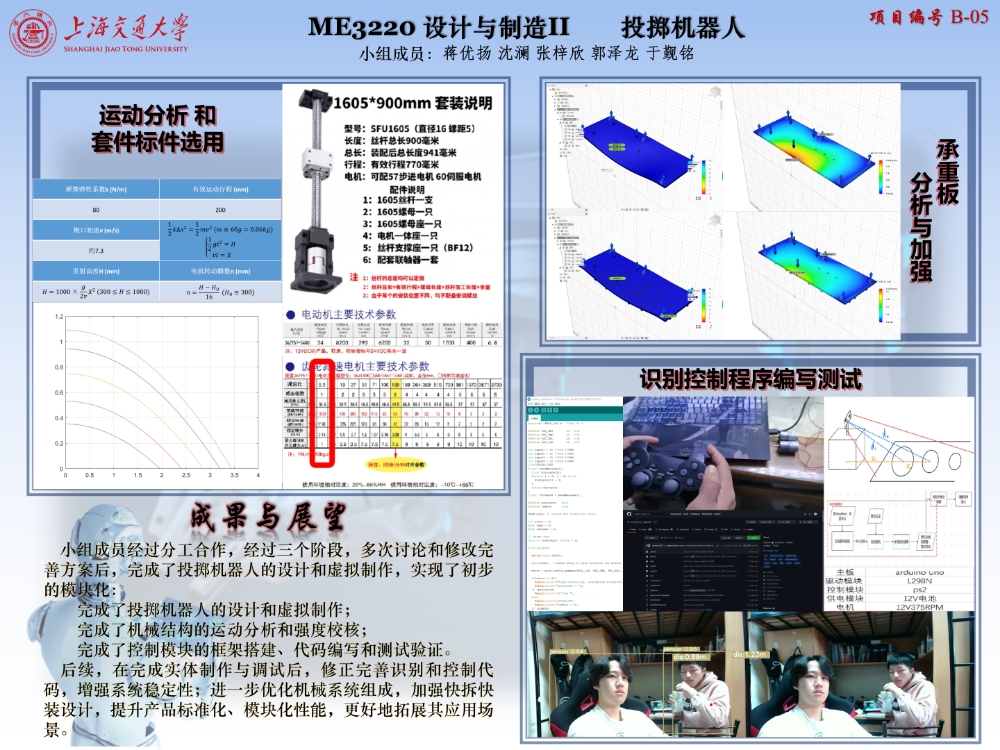小组成员经过分工合作,经过三个阶段,多次讨论和修改完善方案后,完成了投掷机器人的设计和虚拟制作。受限于疫情等外在因素,小组成员未制作产品实体。机械部分,小组完成了发射和自动装填的设计和运动分析,校核了重要承重件的强度。机器人通过压缩和释放弹簧实现网球投掷、通过调节发射高度调节投掷距离,运动模型简洁。整个机械部分中应用较多套件、标件,实现了一定程度的模块化,可靠性好、成本低、更换快捷方便。控制部分,小组完成了基于树莓派和arduino的控制模块代码。借助双目相机、深度学习算法,小组在参考开源代码后实现了从识别目标、读取距离、控制电机的一系列流程操作;同时,小组在其中中整合了手动控制代码,增强了控制模块的可靠性。