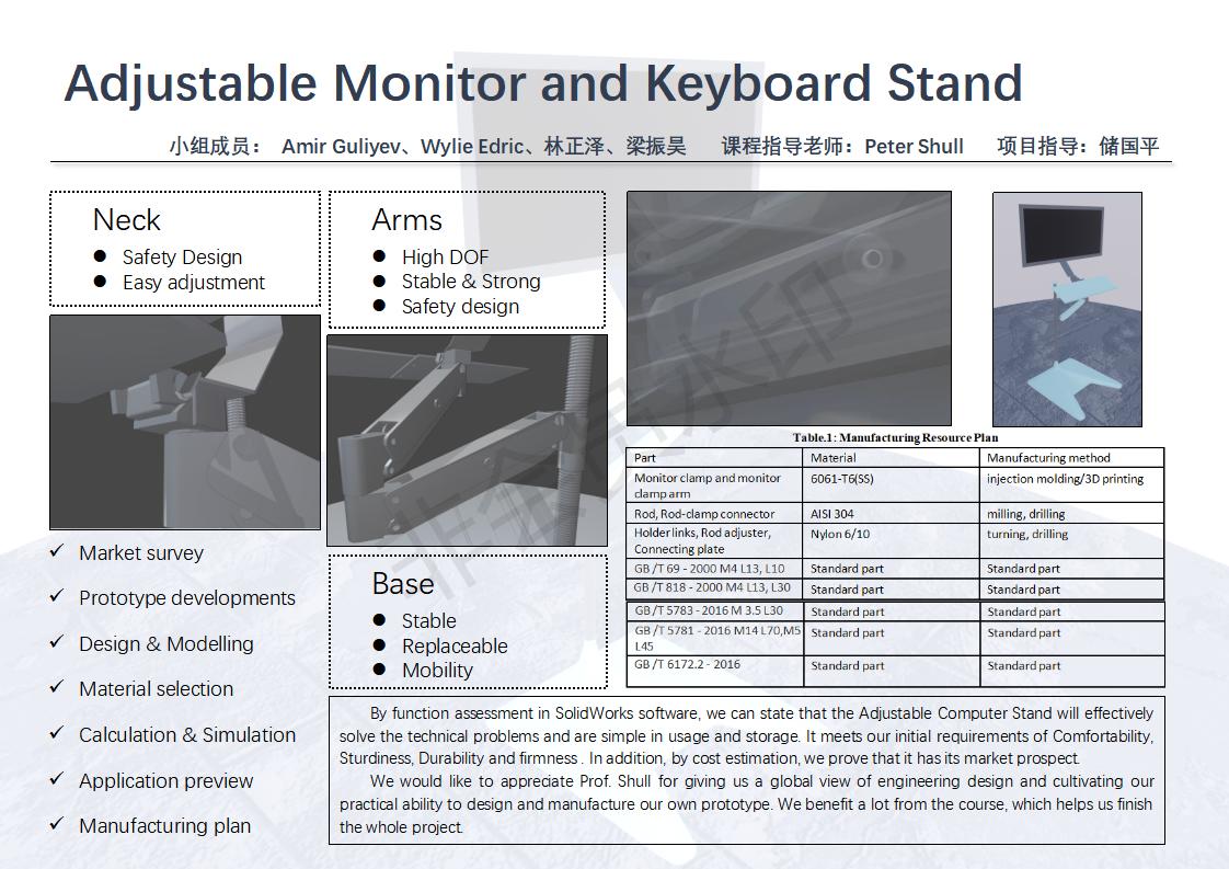 We planed to design a freestanding monitor and keyboard stand which can solve the problems and meet customers’ needs. A majority of people felt a middle or higher discomfort because of the position of their computers. Many expressed their desire to buy a product to solve their problem, with average max price at 188RMB. So basically there is a large number of potential users. We investigated various aspects they focus on, and drew a QFD diagram, which indicated the degree of freedom, or mobility, to be most important. It should be comfortable and friendly to use. Weight and size are also main factors, and we need to ensure strength of structure, to ensure safety. Material selection is of the same level and will influence the factors mentioned. Although appearance is the least emphasized. We will make a design to make it attractive to users.