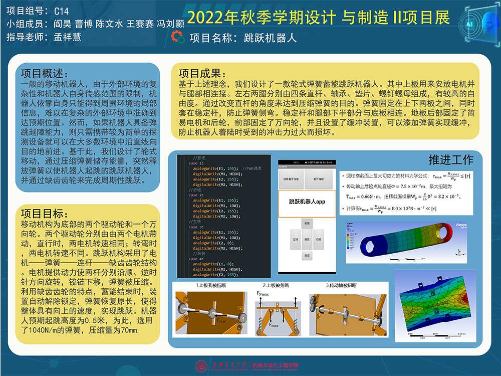 移动机构为底部的两个驱动轮和一个万向轮。两个驱动轮分别由由两个电机带动,直行时,两电机转速相同;转弯时,两电机转速不同。跳跃机构采用了电机——弹簧——连杆——缺齿齿轮结构。电机提供动力使两杆分别沿顺、逆时针方向旋转,铰链下移,弹簧被压缩。利用缺齿齿轮的特点,蓄能结束时,装置自动解除锁定,弹簧恢复原长,使得整体具有向上的速度,实现跳跃。机器人预期起跳高度为0.5米,为此,选用了1040N/m的弹簧,压缩量为70mm.