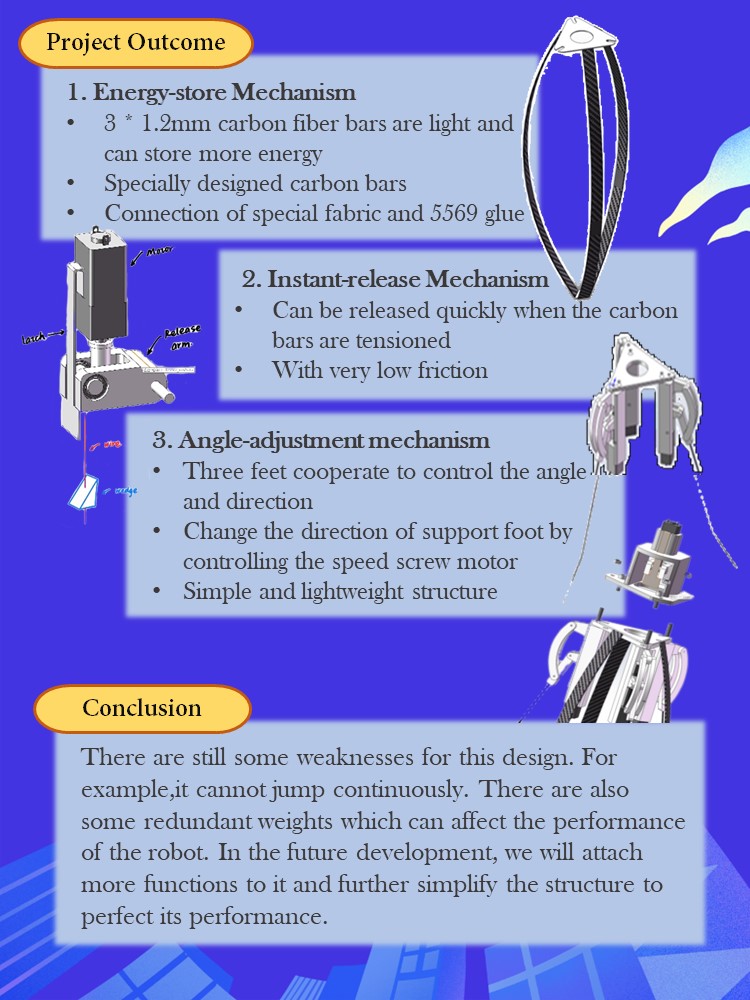 We managed to finish the design in SolidWorks. This robot can perform jumping and has angle adjustment function. The preparation time for jumping is less than 30 seconds. However, the robot cannot repeat the jumping process without human aid. Though we managed to realize the self-righting function, the pull wire system for bending the flexible rods requires human adjustment after each jump.