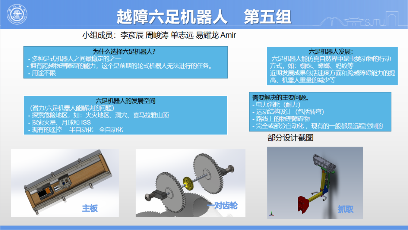 本次设计由于疫情虽无实物成品,但已作出设计图纸与虚拟机模拟。设计最终运用多种机械结构相互配合传动减少了舵机与电机的需求,使得机器人重量、成本都有所控制;同时材料的选取也符合机器人强度以及实际情况,制作相对简单;预计可以稳定地跨越带有一定坡度的地形以及一些颠簸地形;三角步态通过对结构的设计得以实现;遥控与机器人运动控制部分已用代码实现,可进行远距离稳定的操控;搬运部分能以搭载机械爪的形式运送质量较小的物品。
