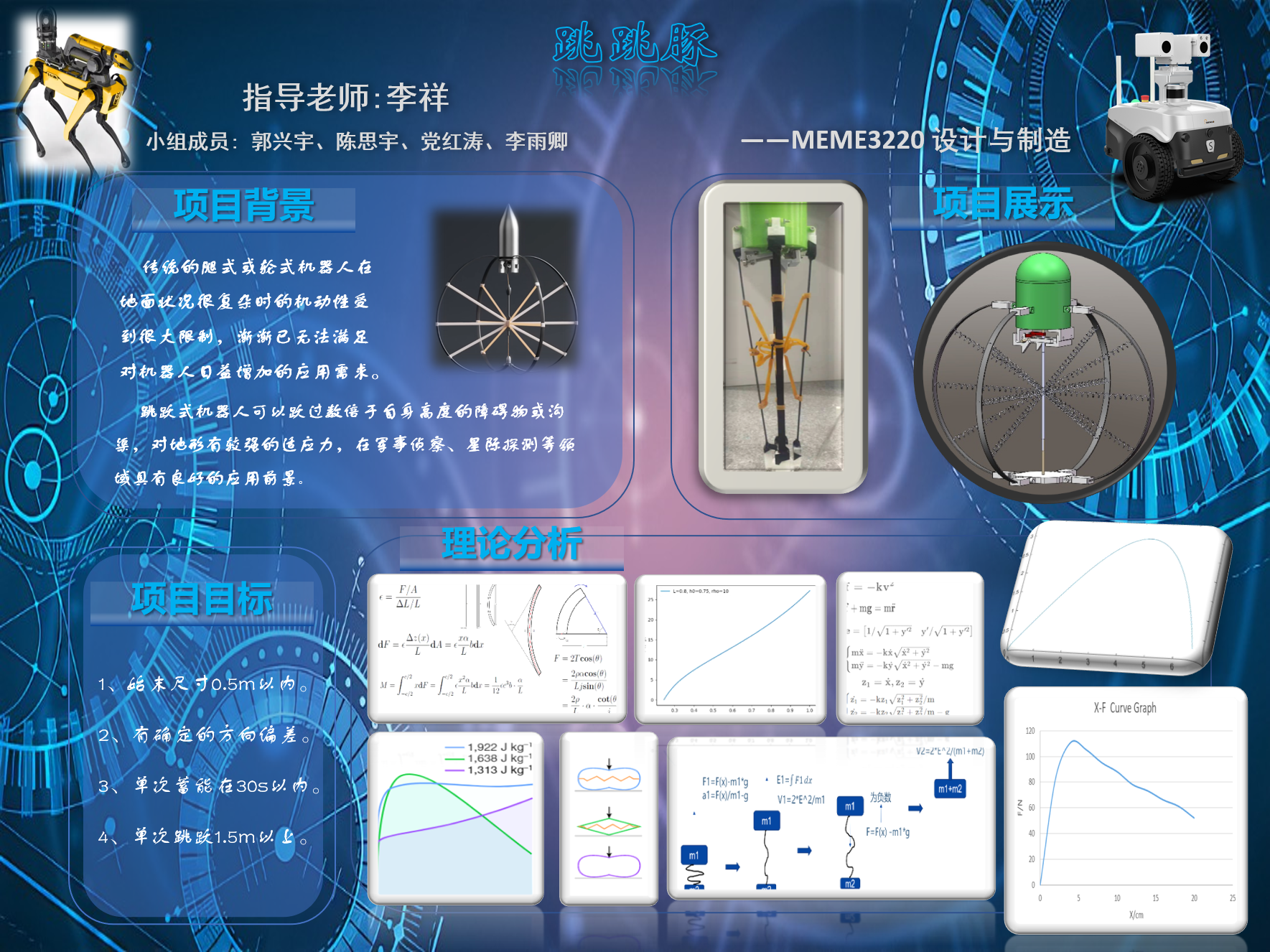 该机器通过力学和运动结构优化,理论上拥有极高的跳跃性能。在30秒内通过完成长时间蓄力,机器立起,调整方向,机构释放,起跳,坠落等动作行为可实现垂直跳跃至少1.5m高度的设计指标。