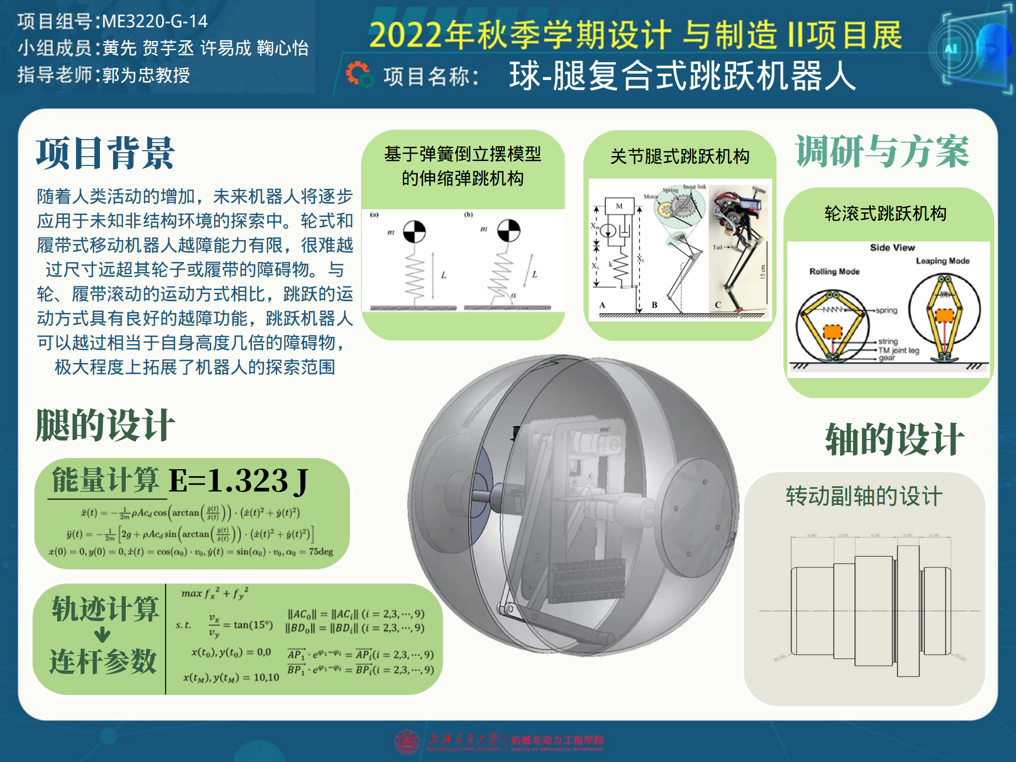 实现基本的运动模式,包括在平地上的前进、后退、转弯等等操作;实现通过距离传感器测量与前方障碍物的距离;实现通过姿态传感器测量自身姿态变化;实现电机、减速箱、四连杆装置以及扭力弹簧的储能,释能过程。实现各个系统的控制与通信。最终希望跳跃时以75°仰角进行起跳,跳跃高度达到1m,姿态检测的误差在1°上下,距离检测的误差在1cm上下。