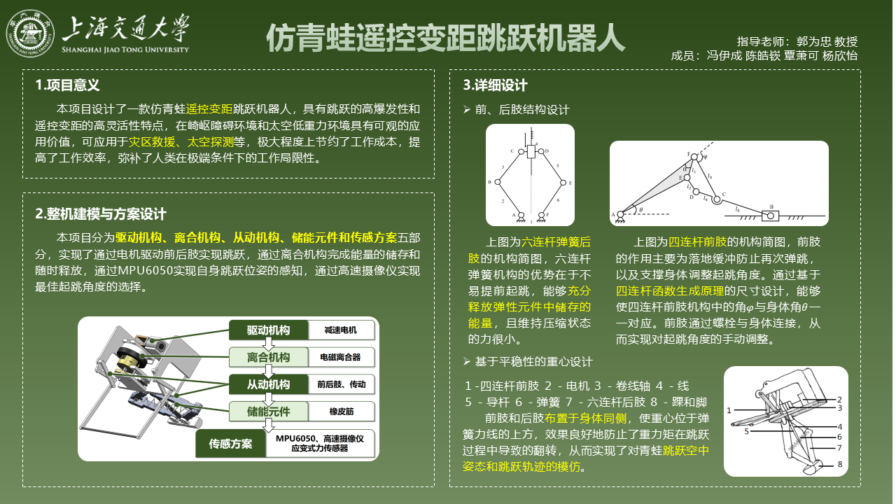 项目设计了一款仿青蛙跳跃机器人,能够实现0-47cm遥控变距跳跃;跳跃过程中机器人姿态平稳,无明显翻倒现象;机器人整体形态与青蛙非常相似,仿生性强;通过MPU6050、自建静态力测量平台和高速摄像仪实现对机器人跳跃位姿的智能感知,并辅助机器人的设计和调试。