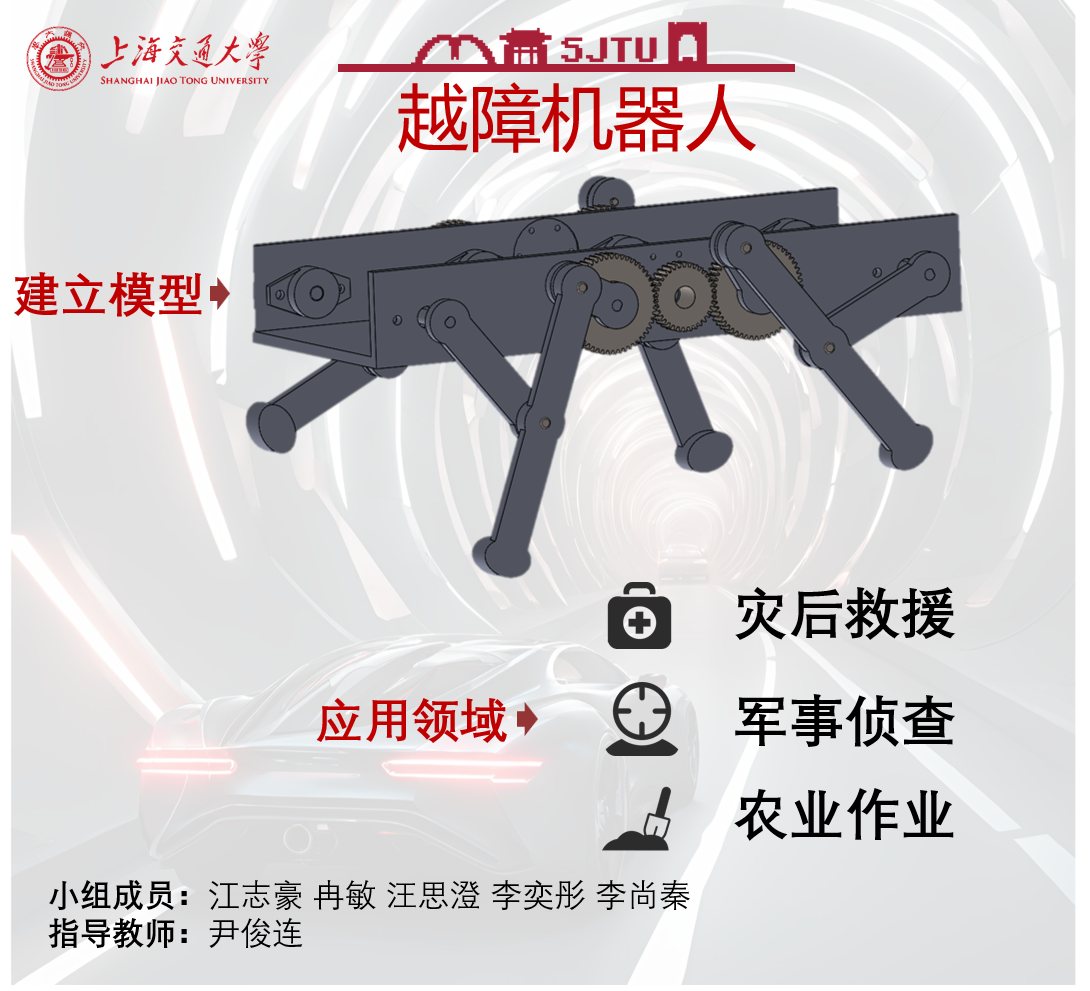 项目要求我们设计一种足式行走/越障机器人,以能适应各类障碍物的跨越。在制作过程中连杆机构;需要采用电机作为原动机,且电机尽可能少,4足机器人建议使用2-4个电机;装置中最好有齿轮、凸轮机构应用;动作过程不得有人力辅助,机构自行动作;最终机器人需要跨越坡道坡度30°,坡高30cm、门洞30cm,高30cm,长50cm和凹坑半径100cm,深30cm3类障碍物