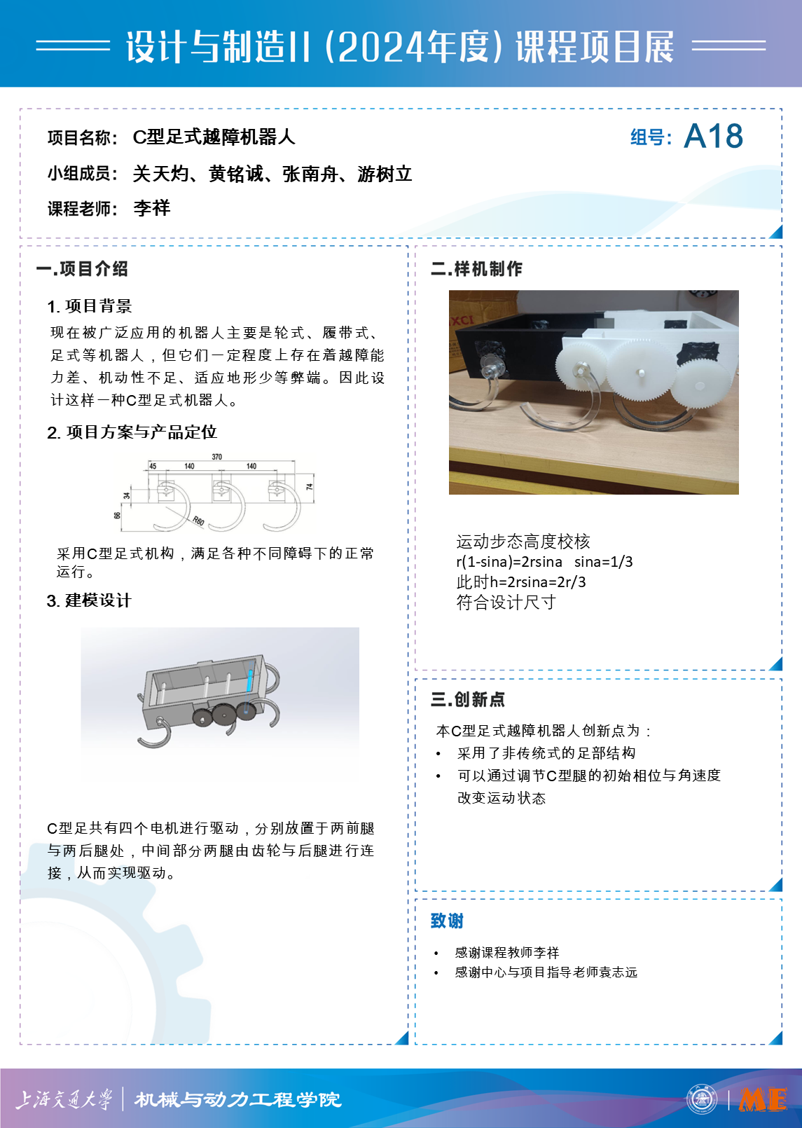 现在被广泛应用的机器人主要是轮式、履带式、足式等机器人,但它们一定程度上存在着越障能力差、机动性不足、适应地形少等弊端。因此设计这样一种C型足式机器人。